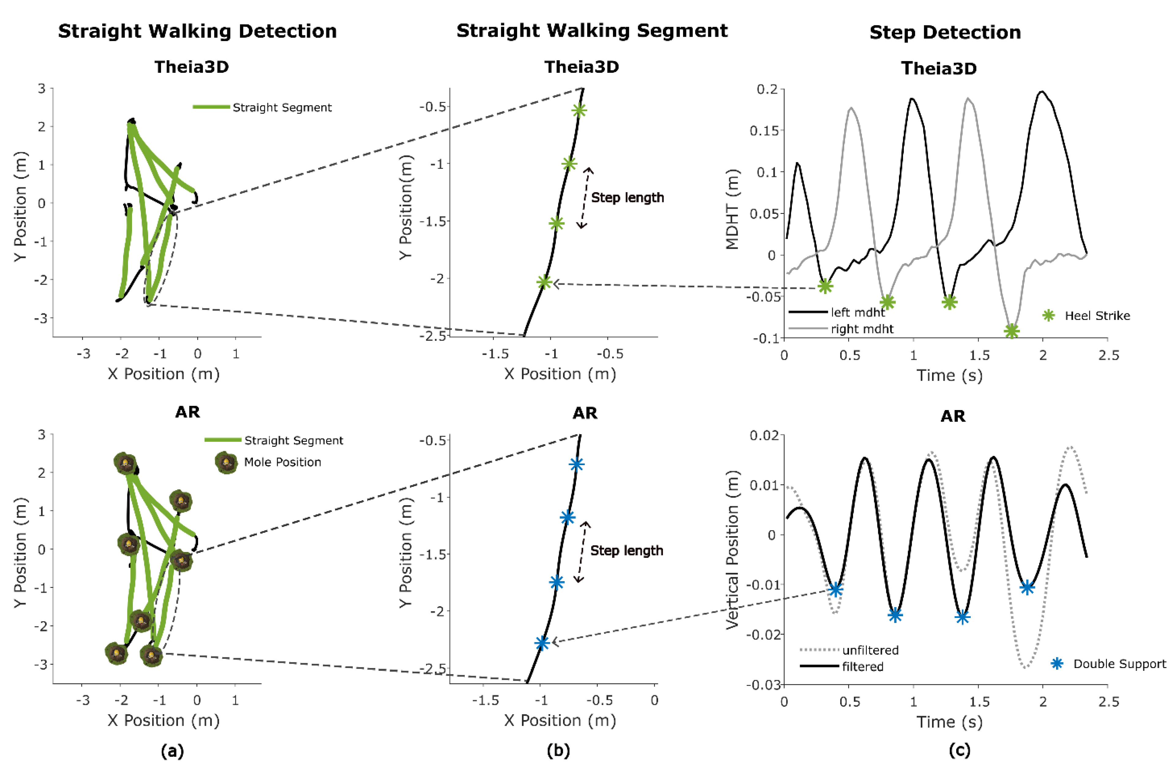 19]. Second, the study lacked a definitive ground truth for motor-state detection. Without labeled reference data, the validation of AR-derived outcomes relies on indirect comparisons rather than true state-by-state agreement. Establishing ground-truth labels through, for example, expert video annotation and applying supervised machine-learning methods could potentially provide a more robust basis for validating AR-derived motor states. Unfortunately, the current dataset was not large enough to support such supervised machine-learning approaches. Third, the pitch correction model applied to the AR vertical position data was empirically derived and may not fully account for individual differences in head motion or posture during walking. Finally, while Theia3D serves as a well-validated markerless motion capture system for accurately estimating the position and orientation of body segments, the subsequent calculation of mobility metrics depends heavily on the specific algorithms and computational pipelines applied to this data. These algorithm pipelines involve steps such as signal filtering, segmentation of gait cycles, event detection (e.g., heel strikes), and parameter extraction. As a result, differences in parameter thresholds or processing assumptions may influence the derived mobility metrics, potentially affecting their accuracy and comparability with other measurement systems or across studies. We, therefore, explicitly reported all parameters, made our dataset publicly available, and provided general flow charts of the processing steps along with pseudocode of the algorithms used in this study.