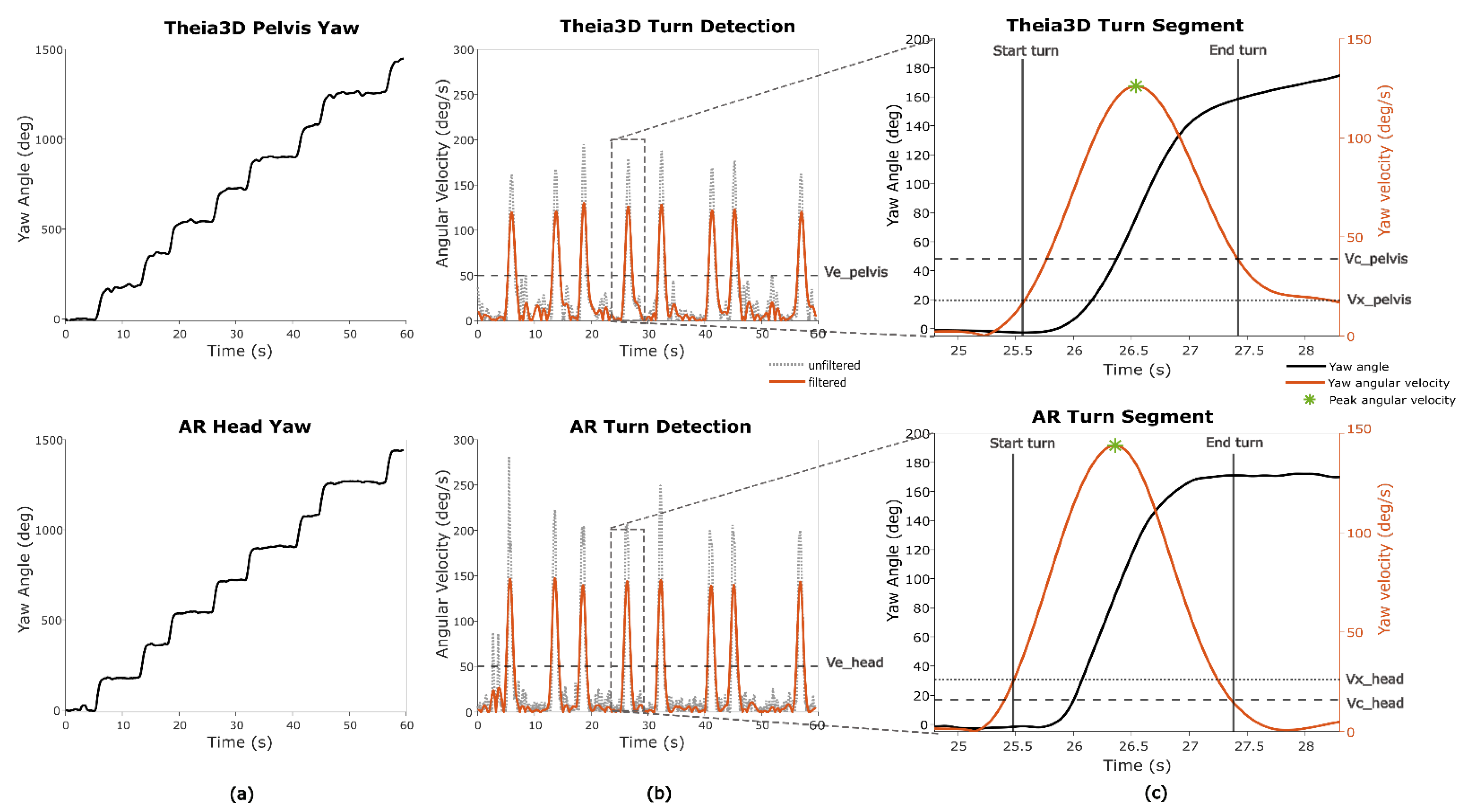 Figure 4b). Different thresholds were used for Theia3D pelvis yaw data and AR head yaw data to account for signal characteristics, with head yaw angles generally showing more variability and sharper angular changes than pelvis-based data (