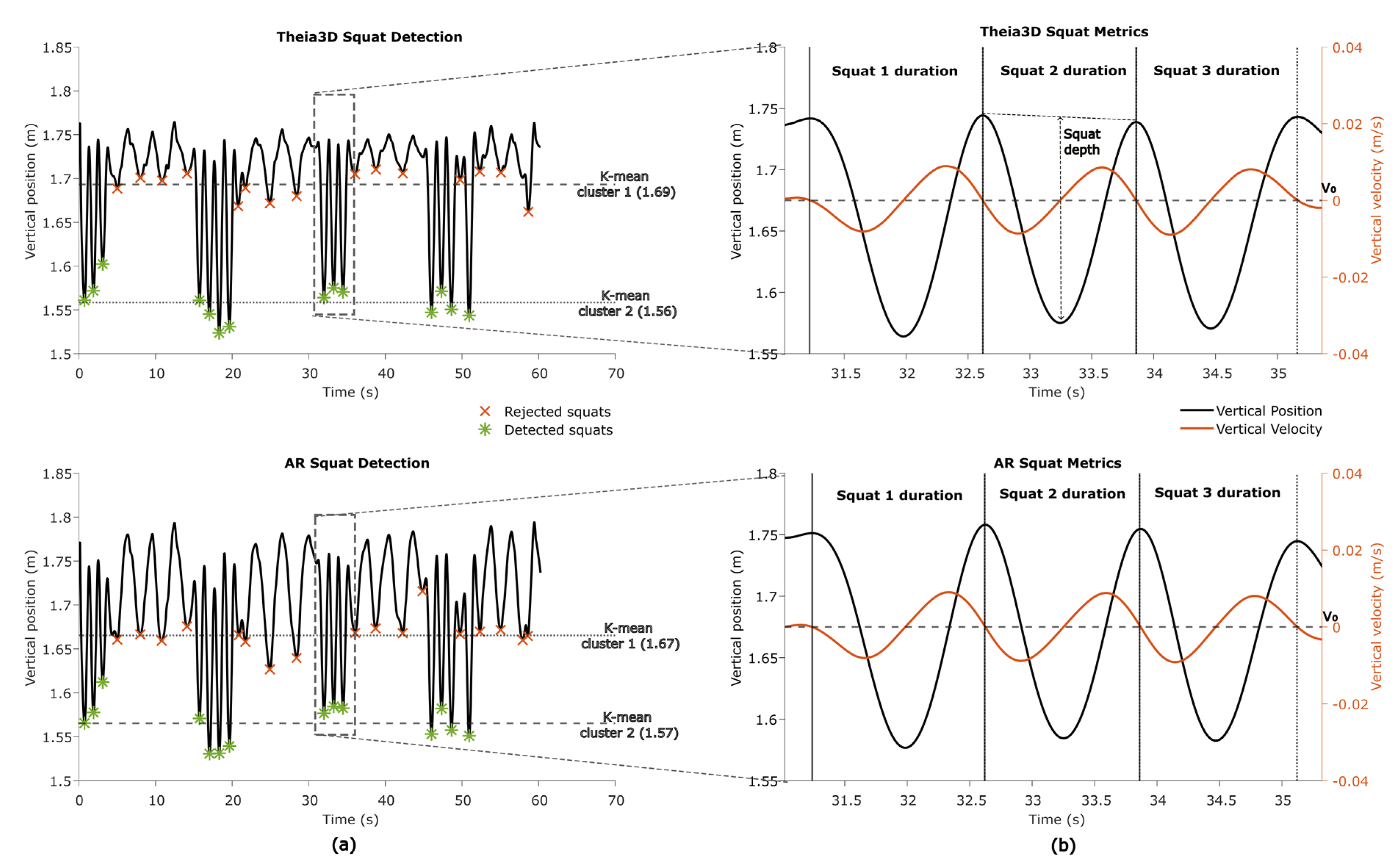 Figure 5a). Valleys that occurred close together (<8 s) were grouped to account for consecutive squats performed in quick succession. Within each group, the vertical velocity signal was used to identify the start and end of individual squats. By searching backwards from each detected valley, the start of the squat was marked at the last time point where the downward velocity reached the zero-crossing. Searching forwards from the valley, the end of the squat was marked at the first time point where upward velocity reached the zero-crossing (
