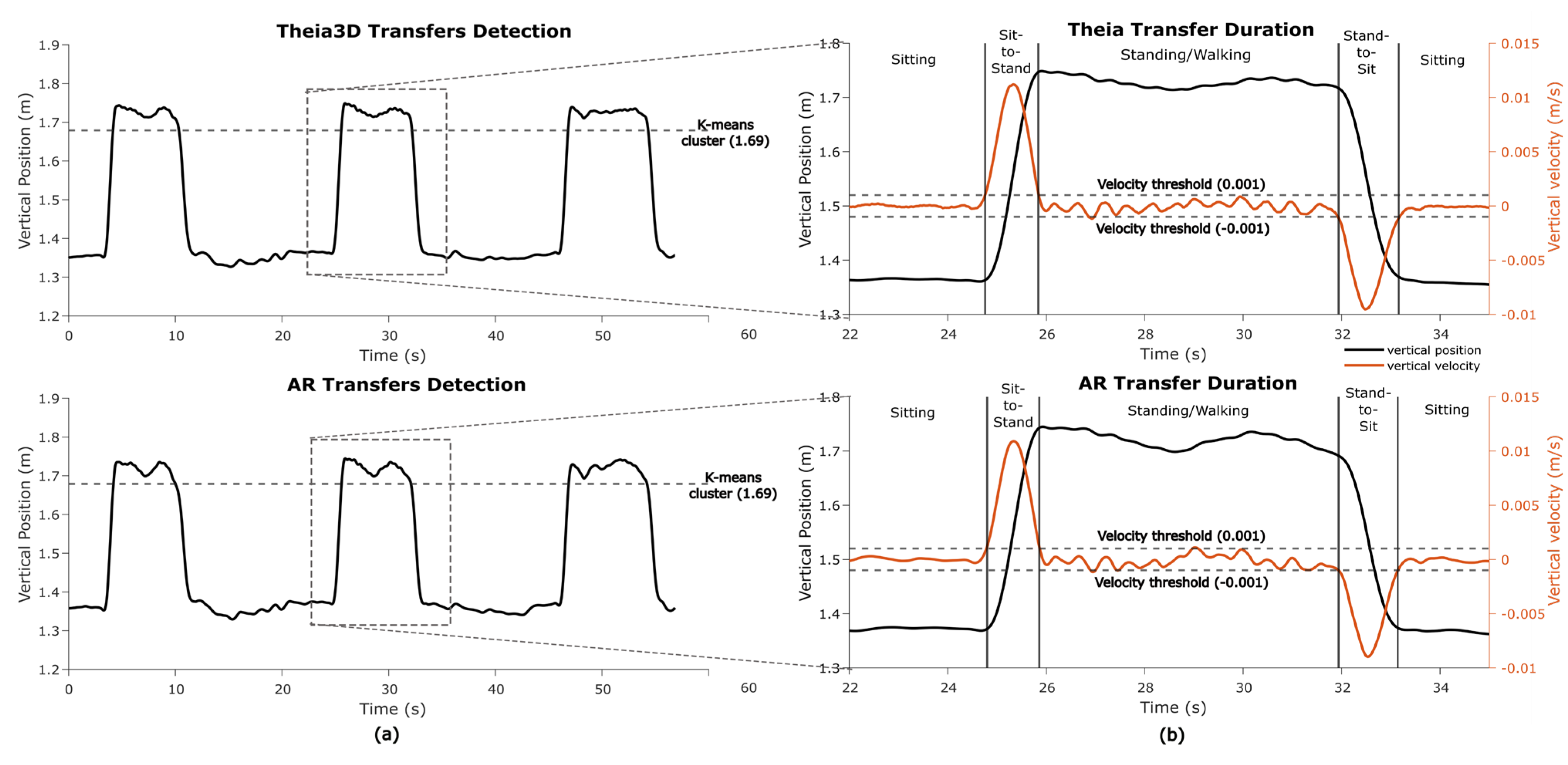 Wobbly Waiter), sit-to-stand and stand-to-sit transfers are key gameplay motor states. To identify transfers, standing segments were first detected using k-means clustering (k = 2, iteration = 10) on the vertical head position data from both the Theia3D and AR systems. The cluster with the highest centroid (i.e., highest vertical position) was classified as standing (