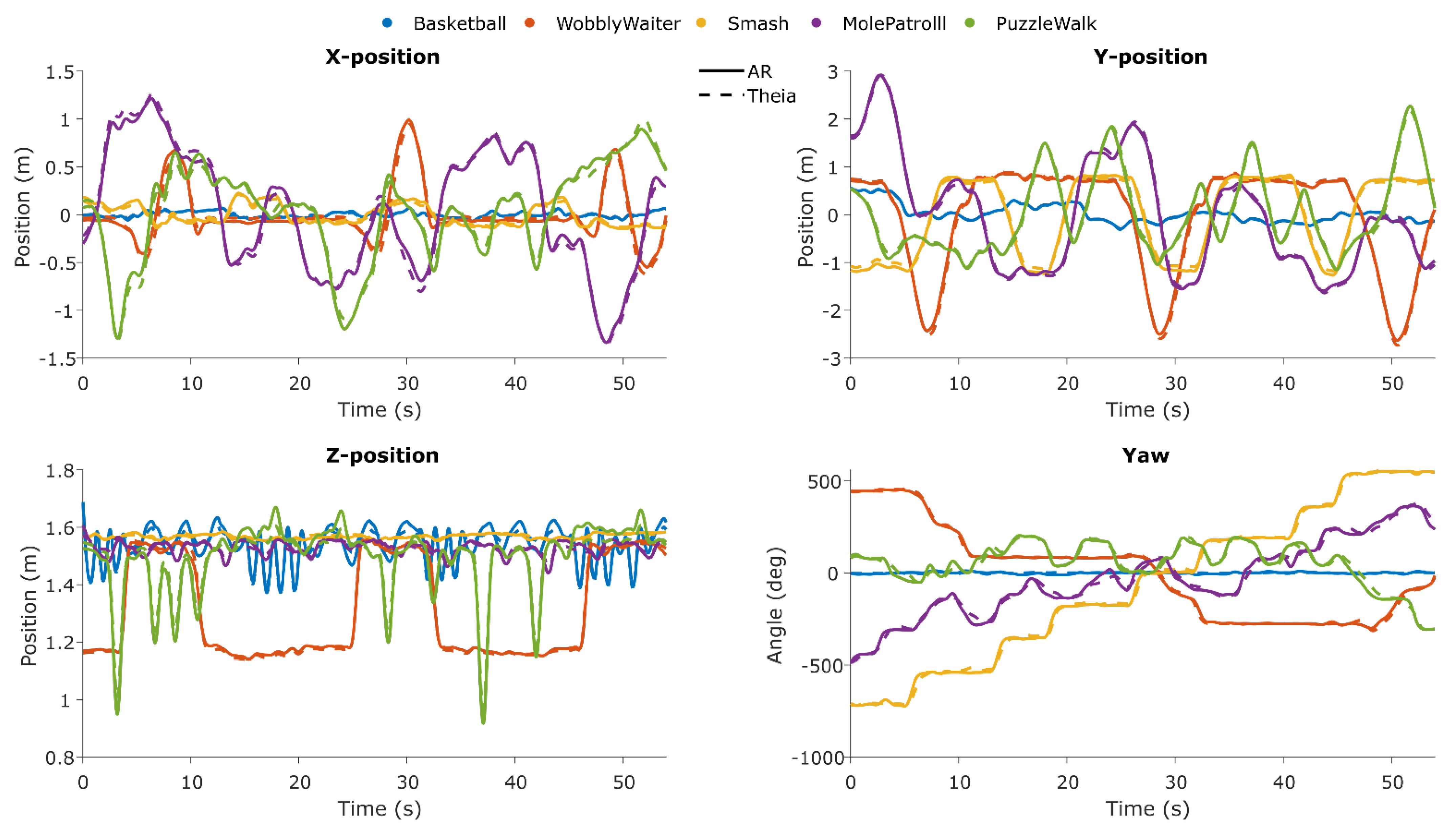Mole Patrolll) from a single participant (P8) was excluded for further analysis because more than 10% of the Theia3D data were missing due to the participant moving outside the camera capture range. Temporal alignment between systems was achieved by calculating the time lag of the maximal cross-correlation of the vertical position of the head from both systems. The consistency agreement between 3D position data of the AR glasses and Theia3D head and between the yaw angle of the AR glasses and Theia3D pelvis was determined separately for each game. Theia3D pelvis yaw was used as a reference for the turning motor state because it provides a more stable and anatomically relevant measure of whole-body rotation, whereas head yaw could be more susceptible to non-turning-related head motions, such as scanning. These additional head movements could inflate angular velocity estimates and introduce noise, potentially reducing the accuracy of turning performance. For all other motor states, the Theia3D head data was used as the reference.