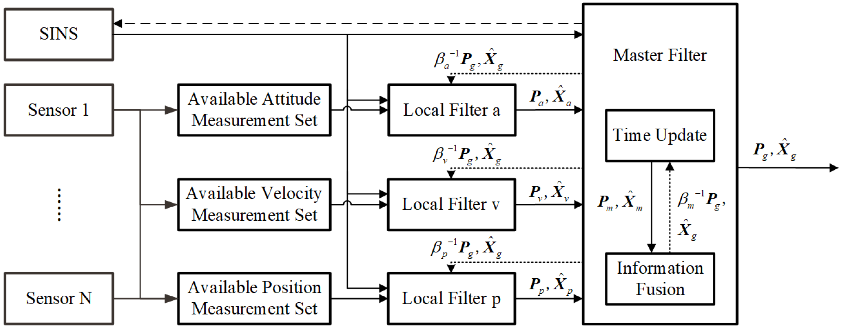 - Xiong, Z.; Chen, J.; Wang, R.; Liu, J. A new dynamic vector formed information sharing algorithm in federated filter. Aerosp. Sci. Technol. 2013, 29, 37–46. [Google Scholar] [CrossRef]