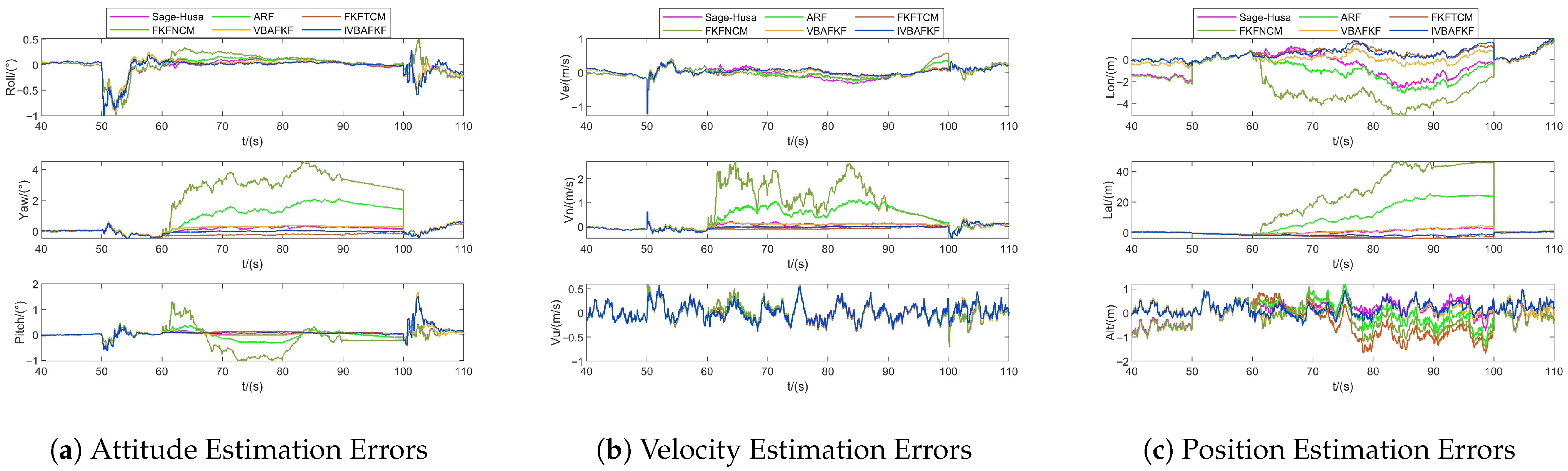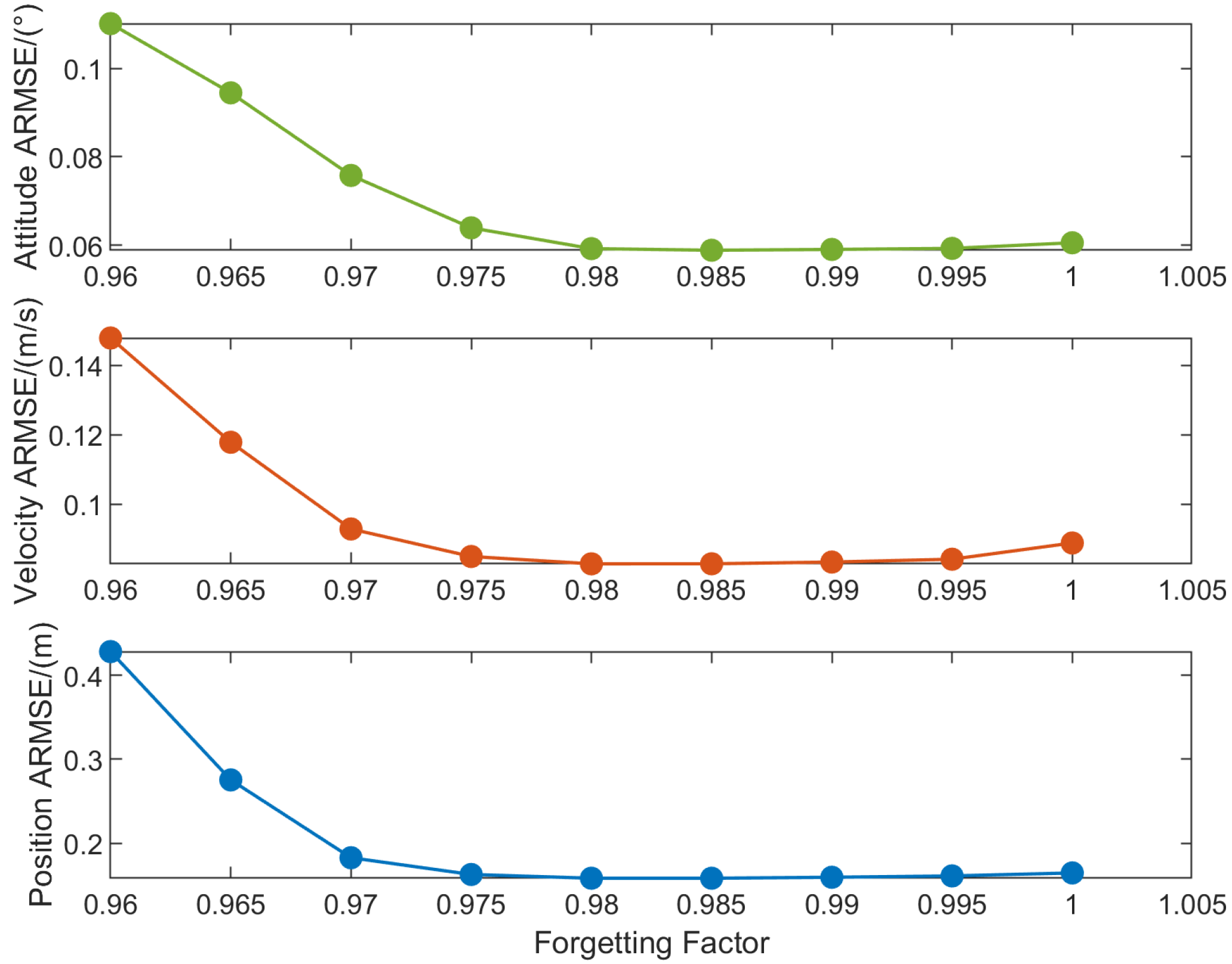 - Based on the IW distribution assumption, VBAFKF dynamically estimates the MNCM using a VBAKF as local filter with a constant forgetting factor. Experimental data show that this algorithm reduces the average ARMSE of navigation states by 41.99% across the four noise scenarios, effectively mitigating the impact of abnormal noise characteristics on filtering accuracy.
