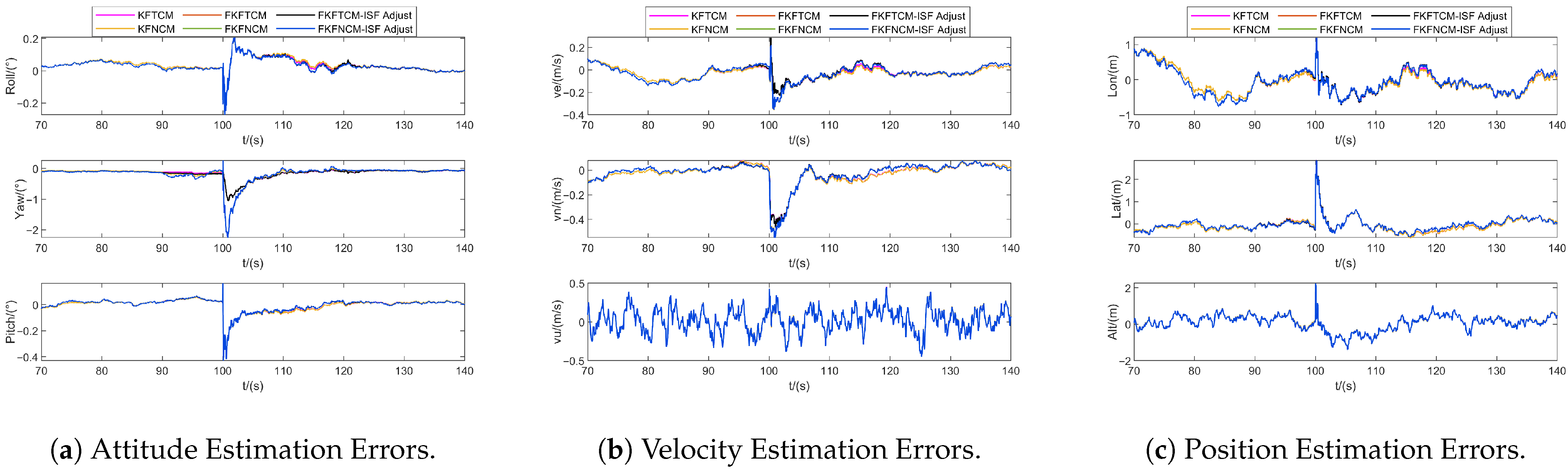 - Hu, G.; Xu, L.; Gao, B.; Chang, L.; Zhong, Y. Robust unscented Kalman filter-Based decentralized multisensor information fusion for INS/GNSS/CNS integration in hypersonic vehicle navigation. IEEE Trans. Instrum. Meas. 2023, 72, 8504011. [Google Scholar] [CrossRef]