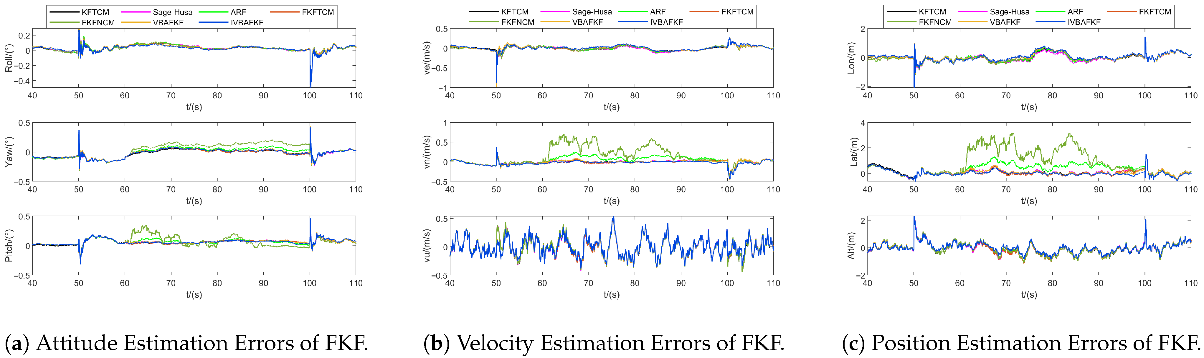 - The navigation accuracy of the proposed algorithm is improved compared to baseline FKF algorithms (e.g., FKFTCM, FKFNCM, and VBAFKF), as demonstrated by performance metrics of ARMSE. The proposed algorithm achieves an average reduction of 43.21% in the ARMSEs of navigation states compared to FKFNCM.