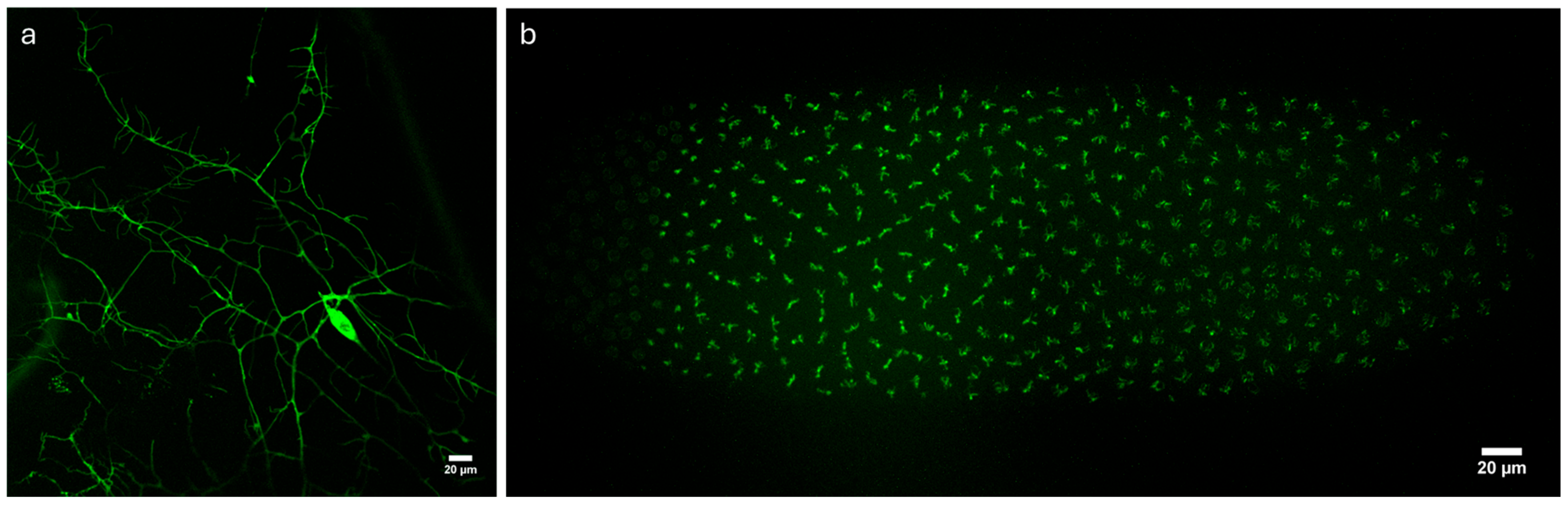 - Feng, G.; Mellor, R.H.; Bernstein, M.; Keller-Peck, C.; Nguyen, Q.T.; Wallace, M.; Nerbonne, J.M.; Lichtman, J.W.; Sanes, J.R. Imaging Neuronal Subsets in Transgenic Mice Expressing Multiple Spectral Variants of GFP. Neuron 2000, 28, 41–51. [Google Scholar] [CrossRef]
