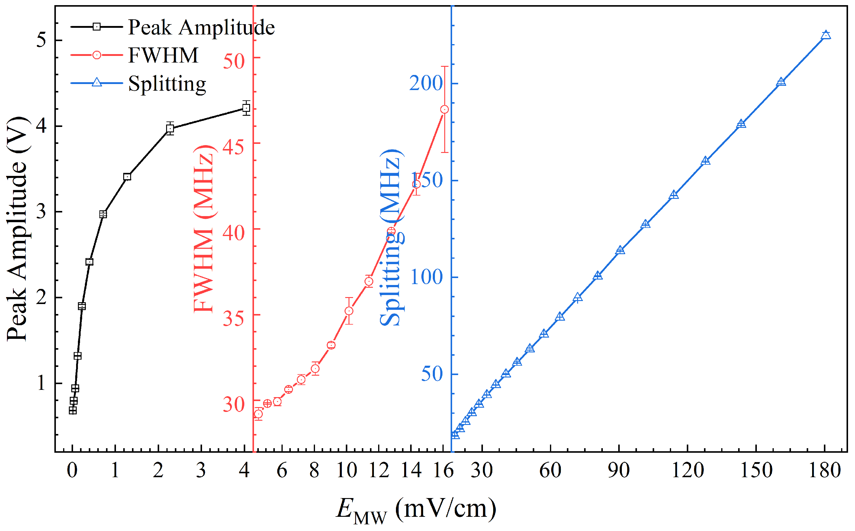 - Liao, K.Y.; Tu, H.T.; Yang, S.Z.; Chen, C.J.; Liu, X.H.; Liang, J.; Zhang, X.D.; Yan, H.; Zhu, S.L. Microwave Electrometry via Electromagnetically Induced Absorption in Cold Rydberg Atoms. Phys. Rev. A 2020, 101, 053432. [Google Scholar] [CrossRef]