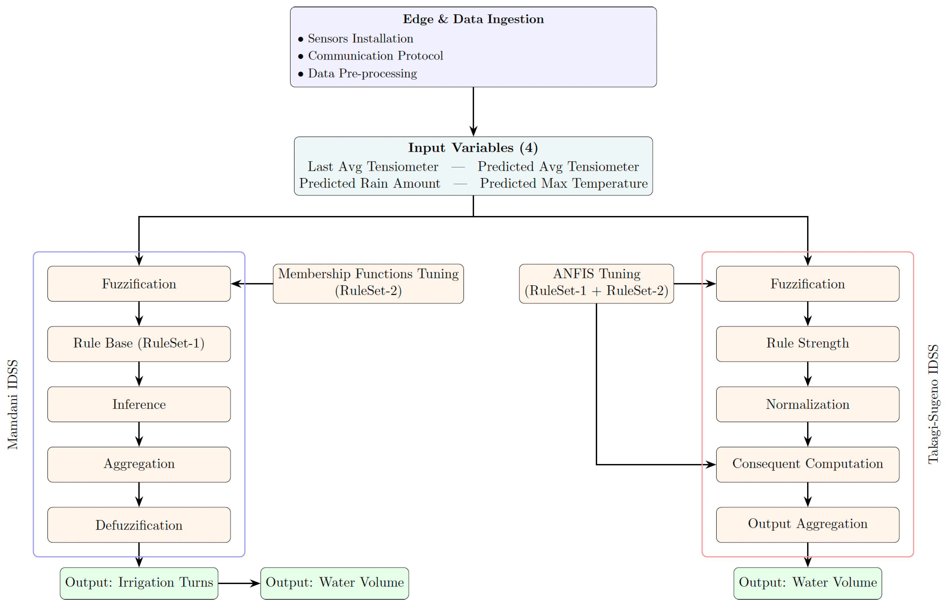 This work compared two fuzzy-logic–based IDSSs for vineyard management, namely a Mamdani-type controller with expert-defined rules and a Takagi–Sugeno ANFIS trained on ultra-local data. They are consistently defined and tested within a unified evaluation framework that combines counterfactual simulation and a stratified block bootstrap. Both systems integrate soil water tension sensing and short-term forecasts, and when employed in real settings, they reduce water use while keeping soil moisture within agronomic bounds.