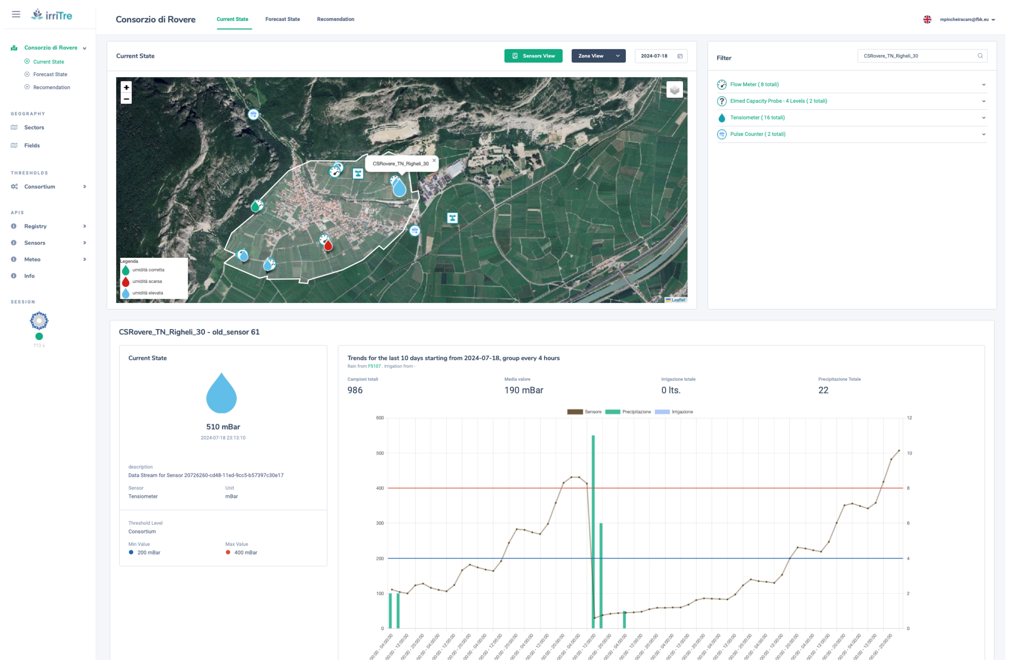 7], and solutions must be viable within the narrow profit margins of farming. Local environmental variability—even within a single field—complicates decision-making, and the growing frequency of extreme weather events demands systems that adapt rapidly to changing conditions. These needs point toward hybrid decision-making approaches that combine ultra-local sensing, which in this work refers to very high-resolution measurements collected directly at the sensor location (i.e., a soil tensiometer installed at a precisely georeferenced position) and not obtained through spatial interpolation, with short-term forecasts, filtered and aggregated at the edge or in the cloud [