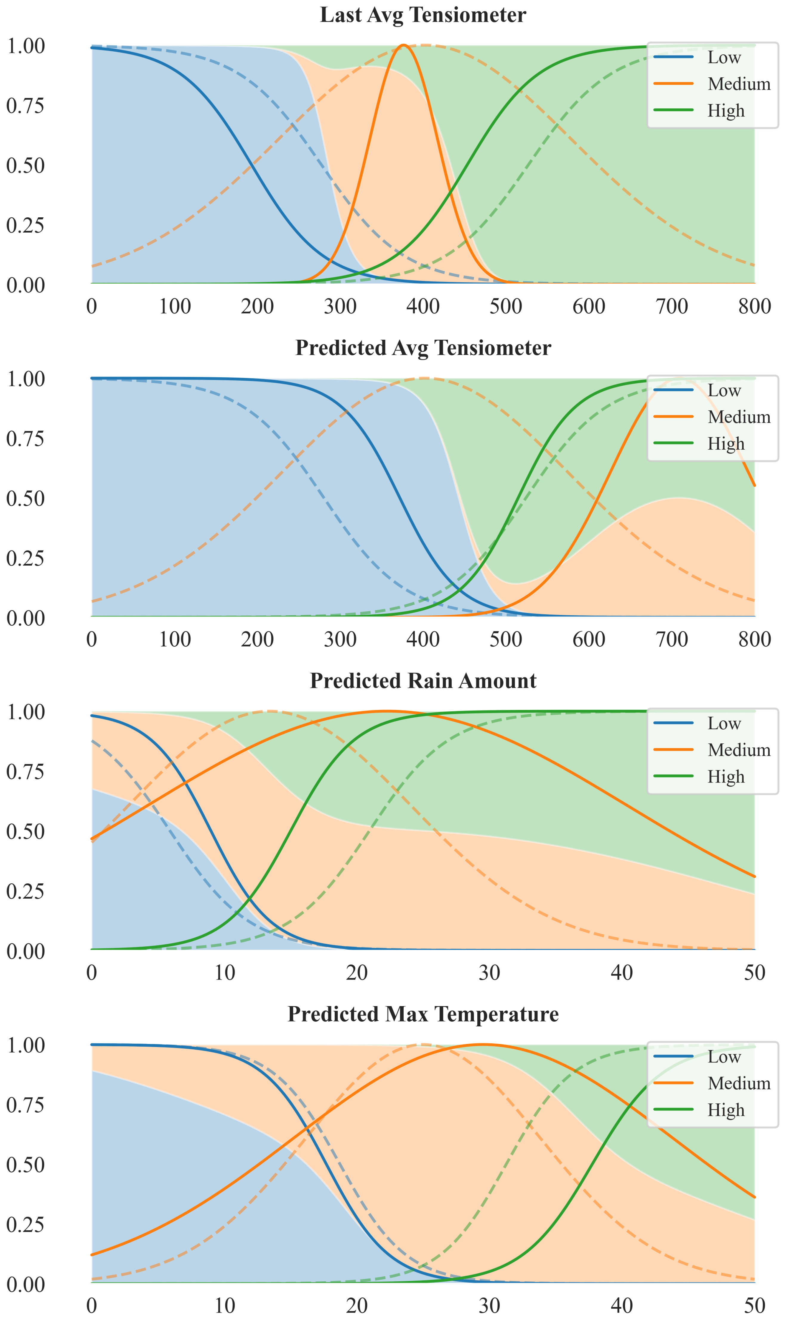 After training, the membership functions of the Last Avg Tensiometer show a pronounced refinement: the Low term becomes sharply confined below approximately 250 millibars (mbar), and the High function rises rapidly just above 400 mbar, drastically reducing the transition zone. This indicates that the model has learned to strongly emphasize recent soil water tension measurements in identifying water stress thresholds. In contrast, the Predicted Avg Tensiometer variable maintains broader and smoother membership transitions. The three linguistic terms remain largely overlapping, with the Medium membership retaining a relatively flat and wide distribution, suggesting a more diffuse contribution of the forecasted moisture values to the model decision boundaries. For the Predicted Rain Amount variable, the membership functions contract around the moderate precipitation range (roughly 10–25 mm). Both Low and High memberships pull away from extremes, indicating a focus on central rainfall values as the most informative for the model’s output. Regarding Predicted Max Temperature variable, the optimized membership functions remain largely similar to their initial configuration. While minor sharpening occurs, particularly around the Medium region, the overall shape and boundaries of the curves are preserved, suggesting that the initial partitioning was already well aligned with the structure of the data in this dimension.