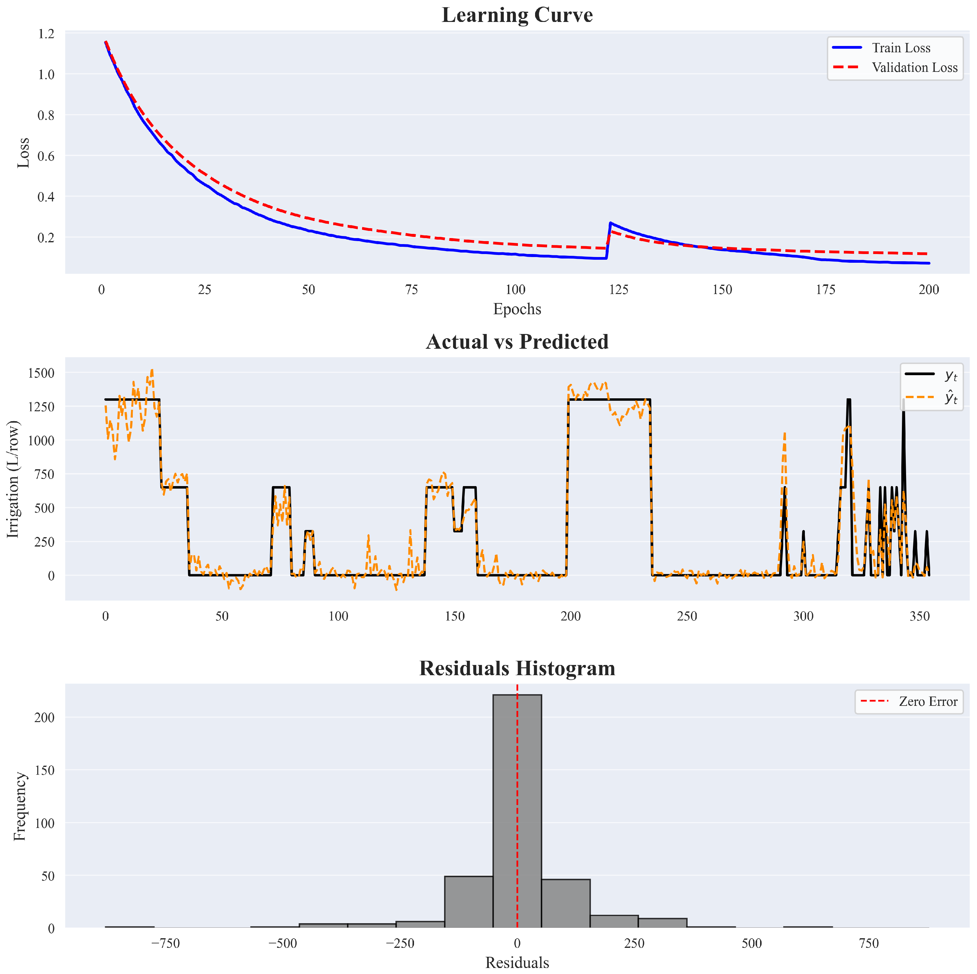 The third subplot shows the histogram of residuals, where each residual is defined as . The distribution is centered around zero, with a high concentration of small errors, indicating accurate model predictions in most cases. The symmetry of the residual distribution suggests that the model does not systematically overestimate or underestimate the suggested irrigation volumes, ensuring balanced predictions. Considering that a single irrigation turn corresponds to 650 L/row, the absolute prediction error exceeds this value only twice, once with a positive residual and once with a negative residual.