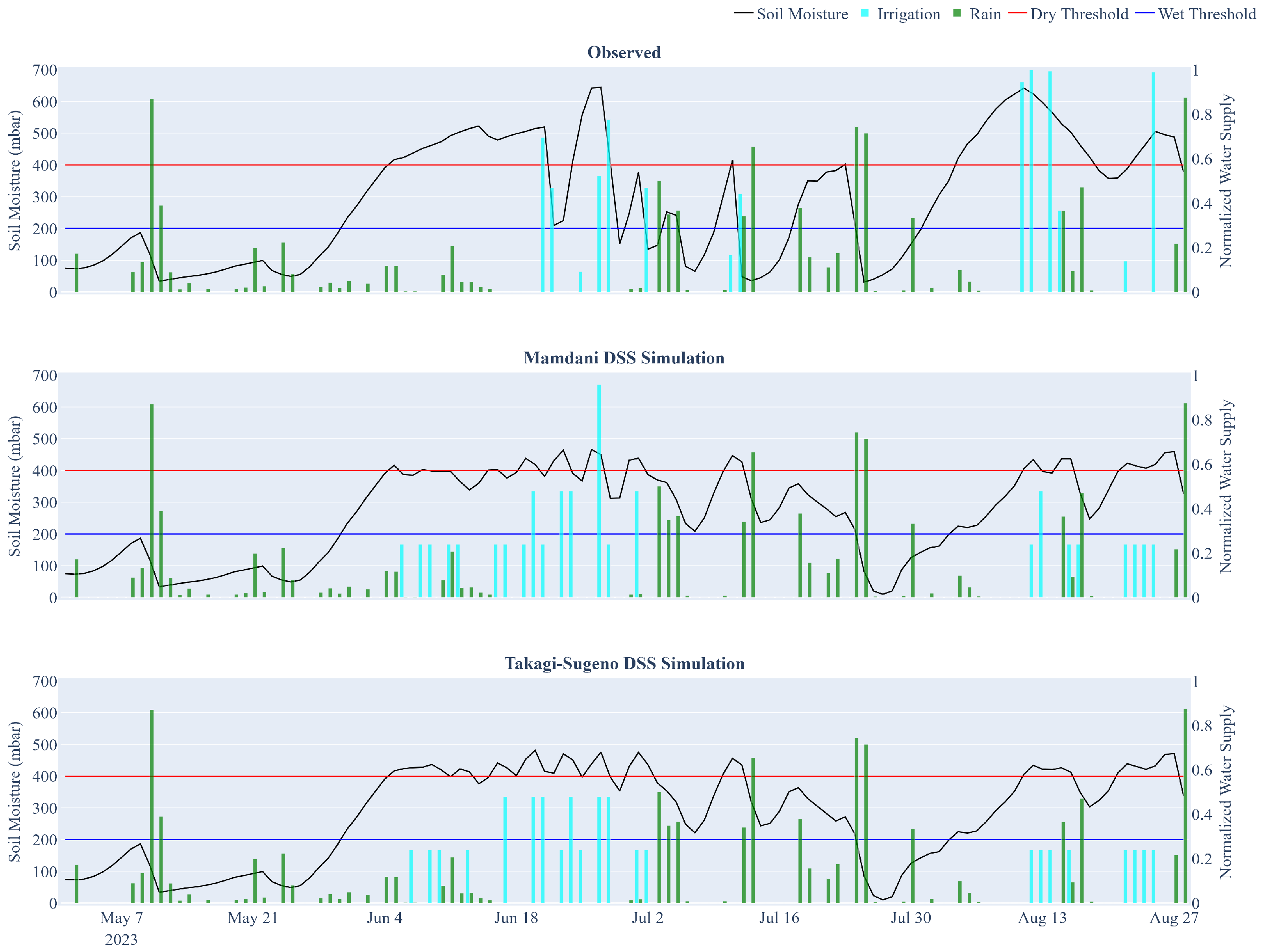 Figure 10 (blue and red lines). Values between these two lines represent the optimal moisture window for crop health. In the observed strategy (top subplot), soil tension frequently drifts outside this range, with several irrigation events occurring shortly before or after substantial rainfall (cyan and green bars, respectively). In contrast, the IDSS simulations distribute water more effectively over time, reduce overlaps with rainfall, and produce tensiometer readings that are generally more stable. Notably, IDSS