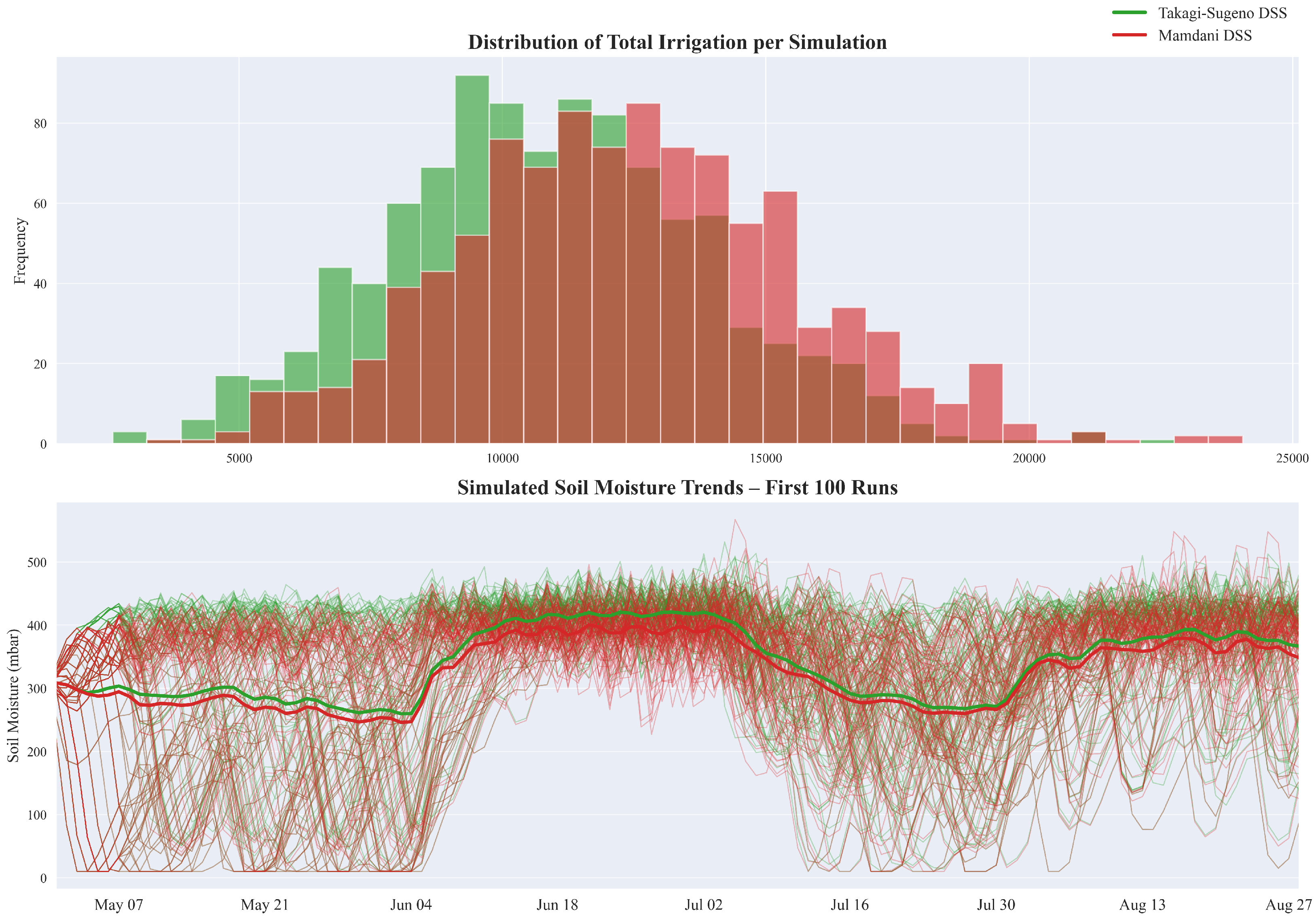 These findings highlight a clear trade-off between the two decision support systems. IDSSTS shows superior performance in minimizing water consumption, while IDSSM is more effective in maintaining favorable soil moisture conditions. The bootstrap-based analysis provides robust support for these conclusions by accounting for variability in weather-driven environmental conditions and confirming the operational distinctions between the two approaches.