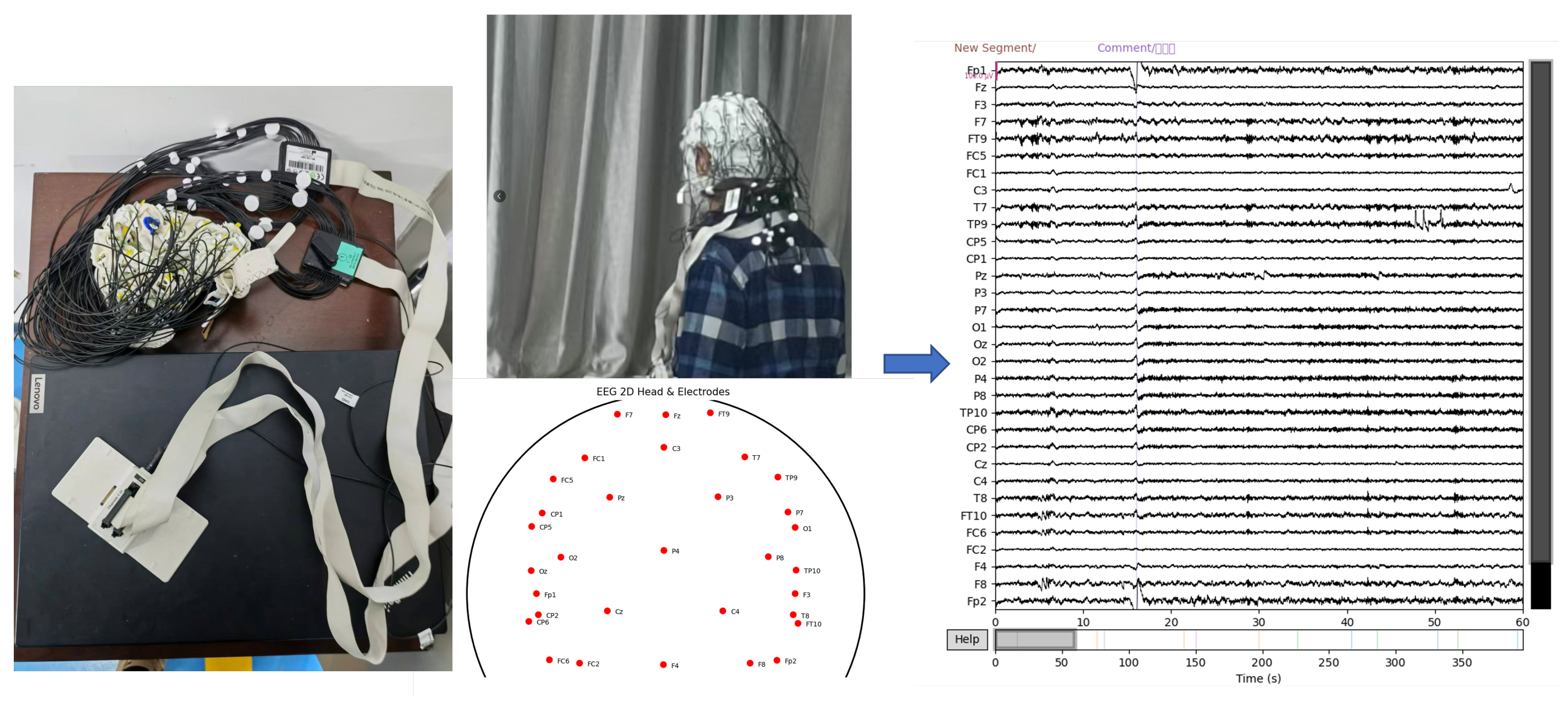The EEG data were collected as part of the study protocol. During data acquisition, participants wore EEG recording equipment and for PD patients, they were instructed not to take medication for 12 h prior to testing, so that PD data were collected in the OFF state. Electrode impedance was checked to ensure proper connectivity. Subsequently, they were instructed to remain relaxed with eyes closed for approximately 5 min while continuous EEG signals were recorded. The EEG recording system employed a 32-channel electrode layout for signal acquisition with a sampling rate of 500 Hz. A schematic illustration of the data acquisition process and the raw EEG signals is shown in