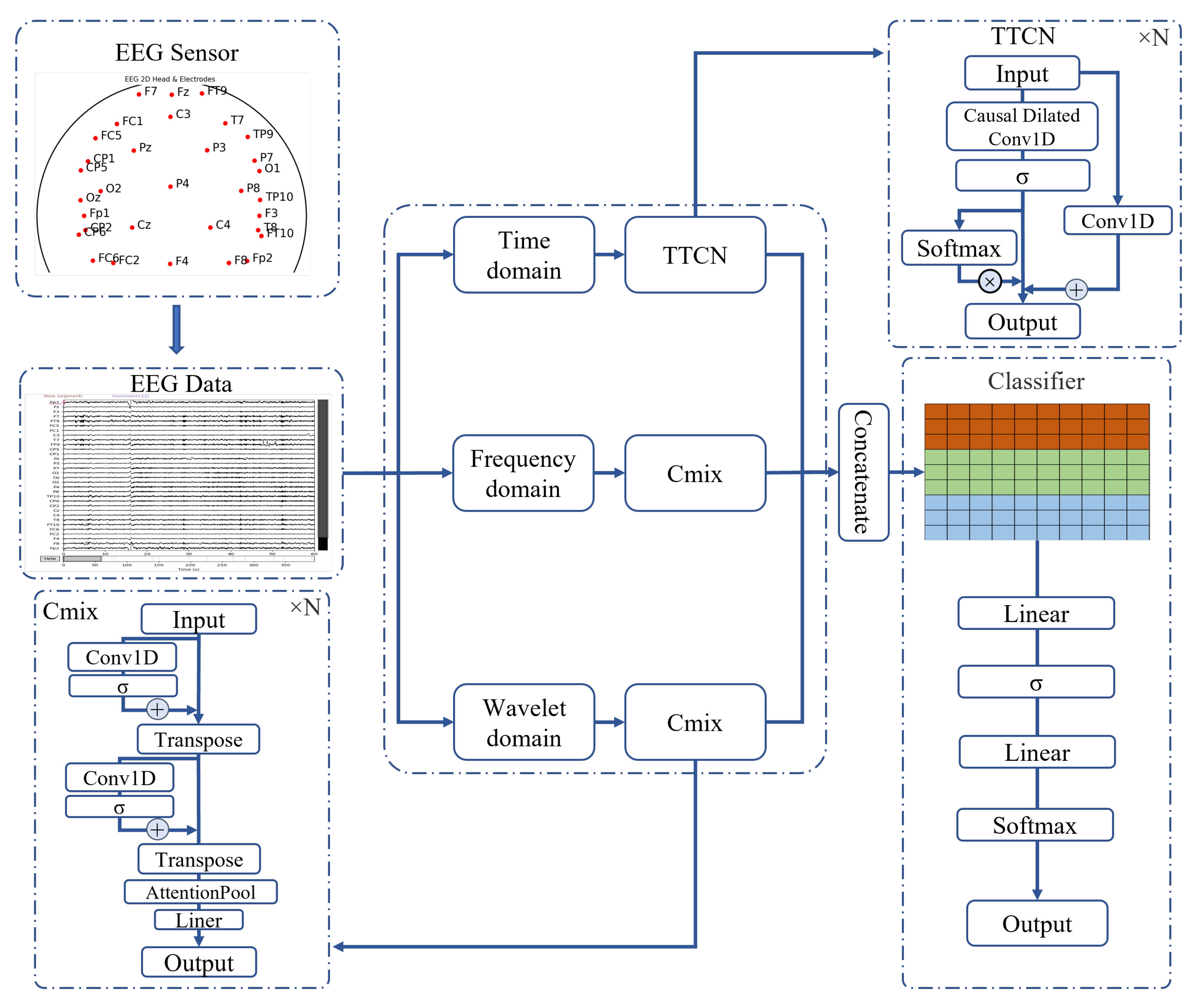 15] features. The proposed model effectively extracts discriminative features from EEG signals across multiple domains. A Temporal Convolutional Network (TCN) [