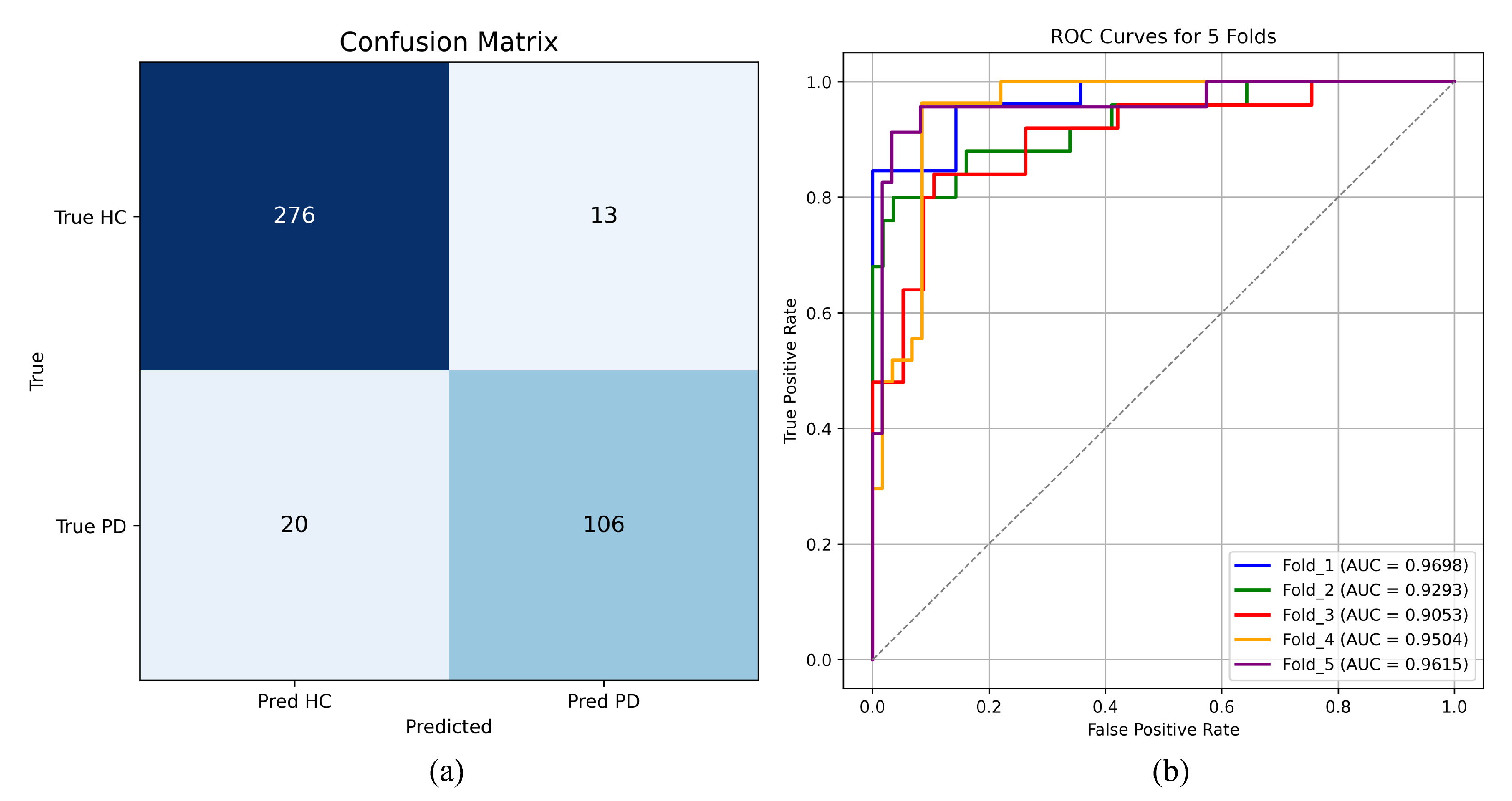 The model demonstrated consistently high performance across all folds, achieving an average accuracy of 92.3%, precision of 88.7%, recall of 86.5%, F1 of 87.3%, and AUC of 0.943. These results indicate that the model not only accurately identifies PD samples but also maintains a balanced precision–recall trade-off, which is particularly valuable given the class imbalance in the dataset, where the ratio of HC to PD samples is approximately 7:3.