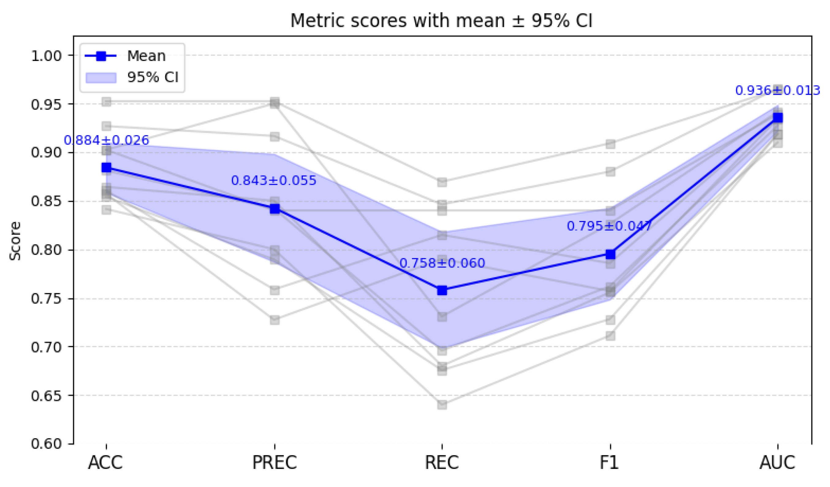 Based on the repeated hold-out experiments, MDF-Net achieved the following average performance: ACC = 88.4 ± 2.57%, PREC = 84.3 ± 5.55%, REC = 75.8 ± 5.97%, F1 = 79.6 ± 4.70%, and AUC = 0.936 ± 0.013. These findings indicate that MDF-Net maintains strong classification performance and high consistency across multiple random splits, with relatively low variation between runs.