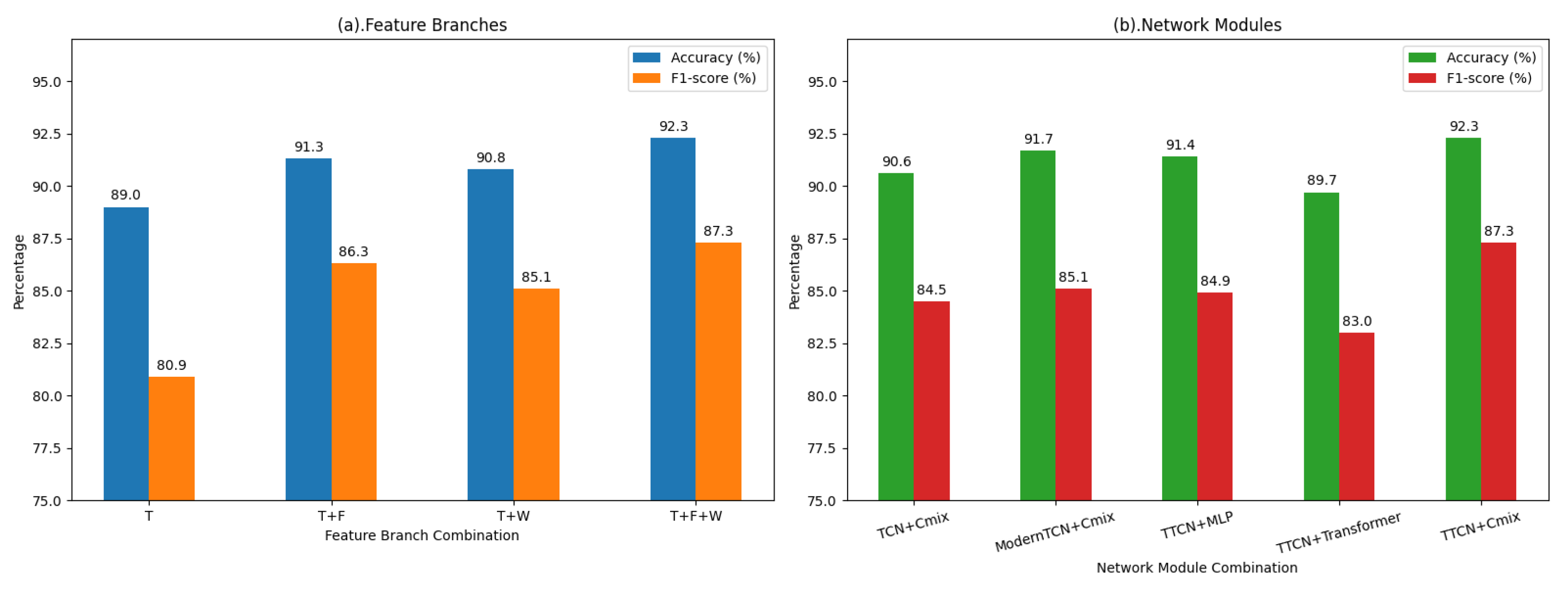 Overall, the ablation experiments demonstrate that integrating time-domain (T), frequency-domain (F), and wavelet-domain (W) features with TTCN for temporal modeling and Cmix for non-temporal feature fusion achieves the best overall performance, with 92.3% accuracy, 87.3% F1-score, and 0.943 AUC, highlighting the effectiveness of the joint use of three domains and specialized modules in enhancing discriminative power and generalization.