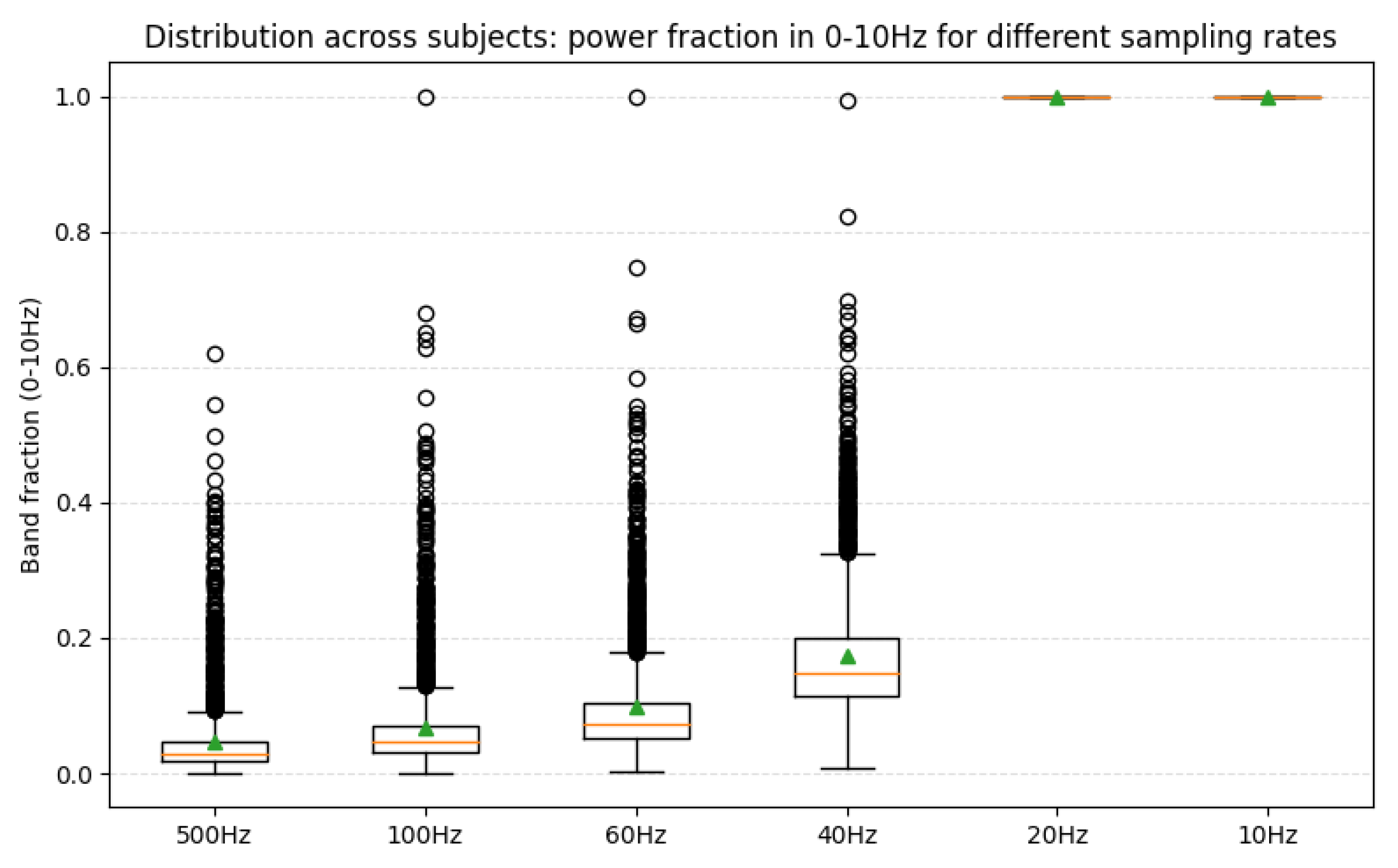 52]. We analyzed the relative power of the 0–10 Hz frequency band under different sampling rates. The average power proportion within this band was only 4.6% at 500 Hz, 6.9% at 100 Hz, 9.8% at 60 Hz, 17.4% at 40 Hz, and 100% at 20 Hz, consistent with the Nyquist sampling theorem [