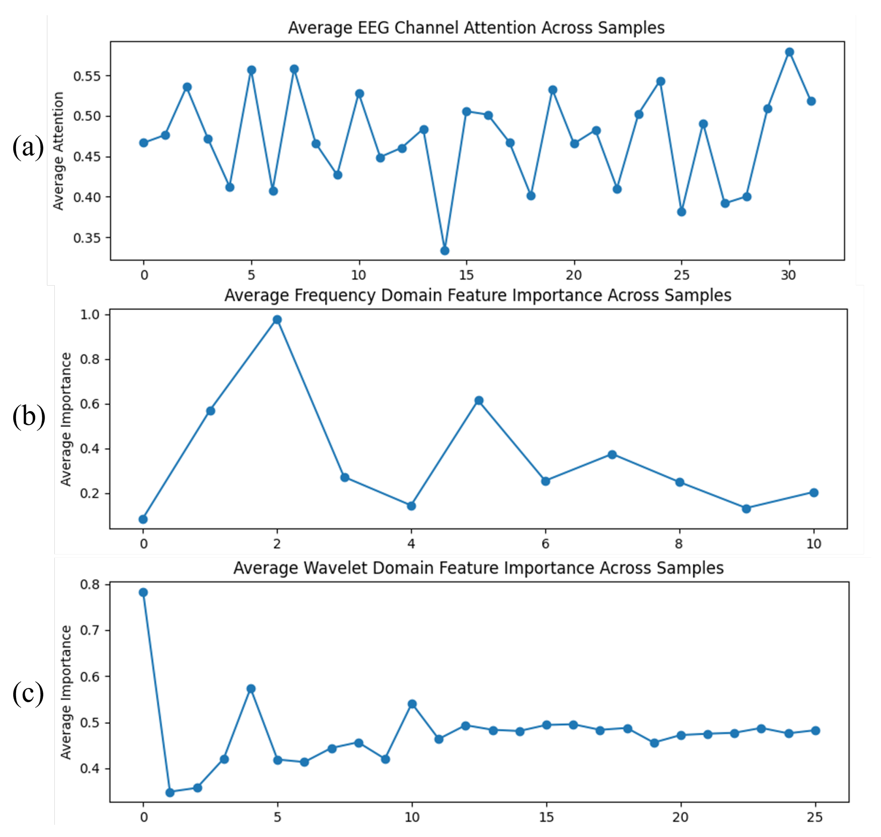 To gain deeper insight into the discriminative mechanisms of MDF-Net, we visualized the attention weights assigned to 32 EEG channels, 11 Fourier frequency bins, and 26 wavelet coefficients, averaged across all EEG data, as shown in