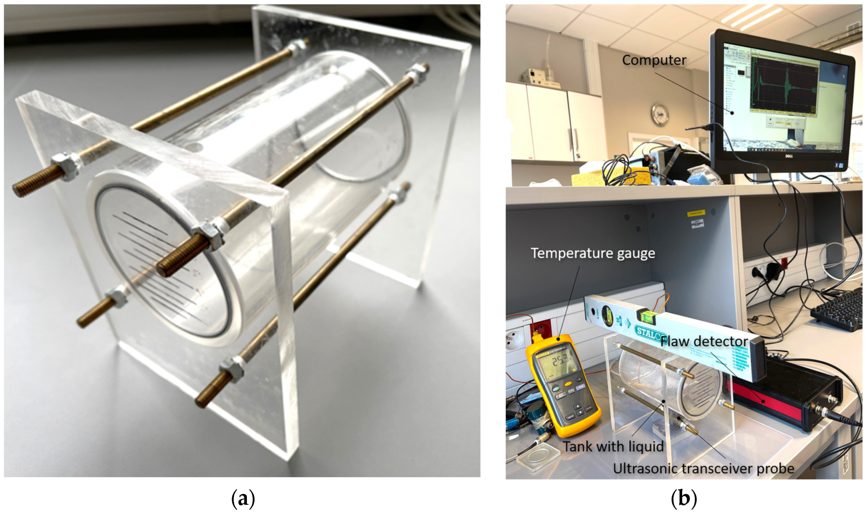 Figure 3). Ultrasonic pulses reflected from the surface of the liquid in the tank were recorded each time in three different measurement time windows: long—covering the transmitted pulse and the pulse reflected from the surface of the liquid (view window), measuring—covering only the reflected pulse, zoomed—covering the reflected pulse in amplitude magnification.