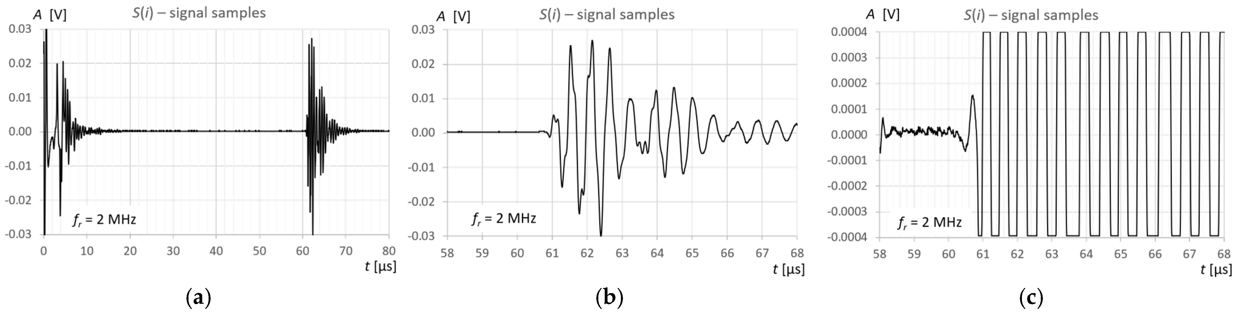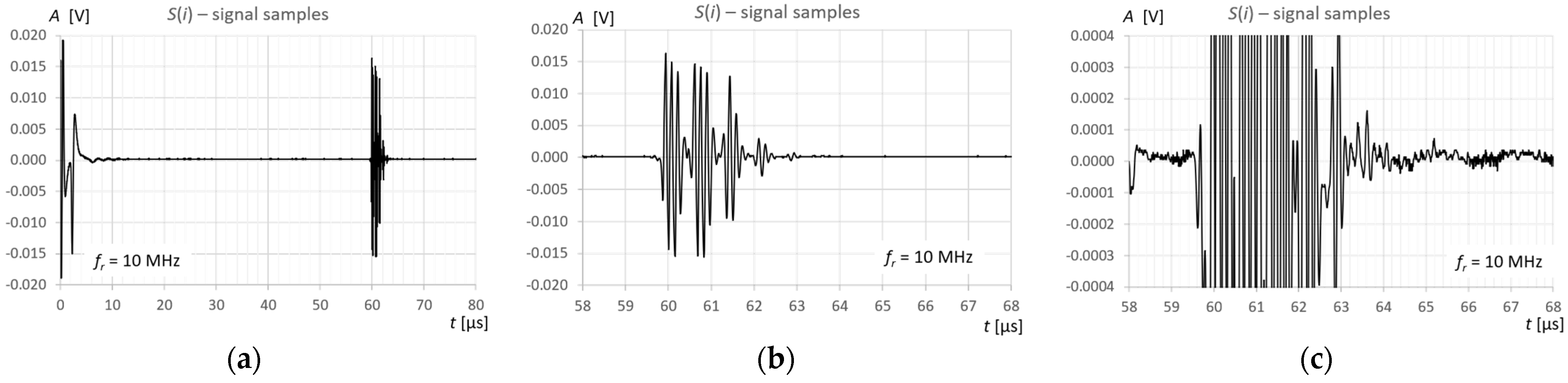 Figure 11b) by approximately 200 ns, which corresponds to a twenty-fold distance between samples at the applied signal sampling frequency. The measurement error is still small and amounts to approximately +0.33% in relation to the measured time value. When using the threshold method in a standard window with a 10% threshold set in relation to the maximum pulse amplitude (blue color in