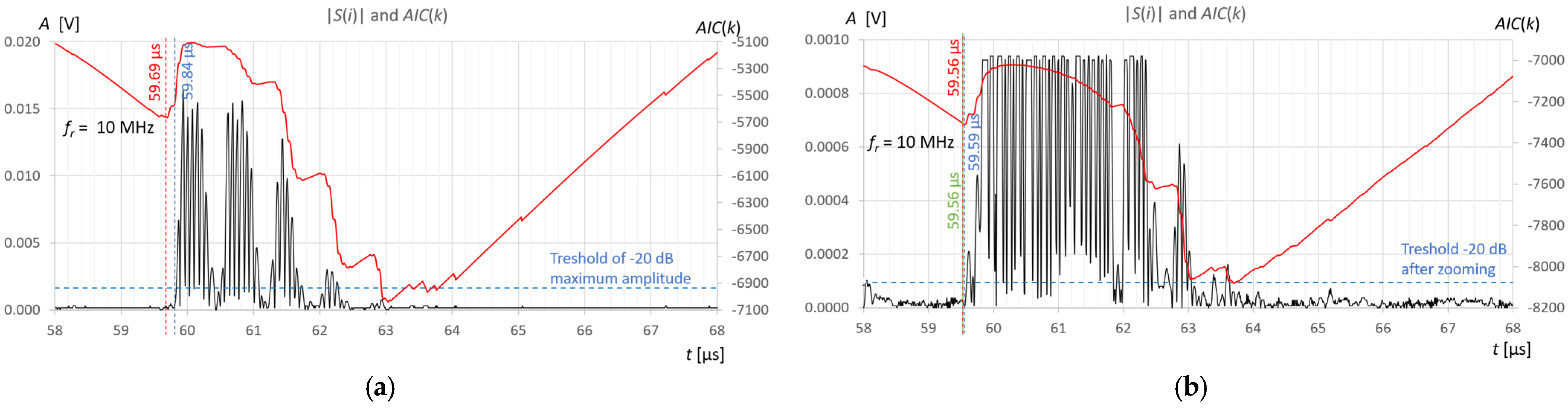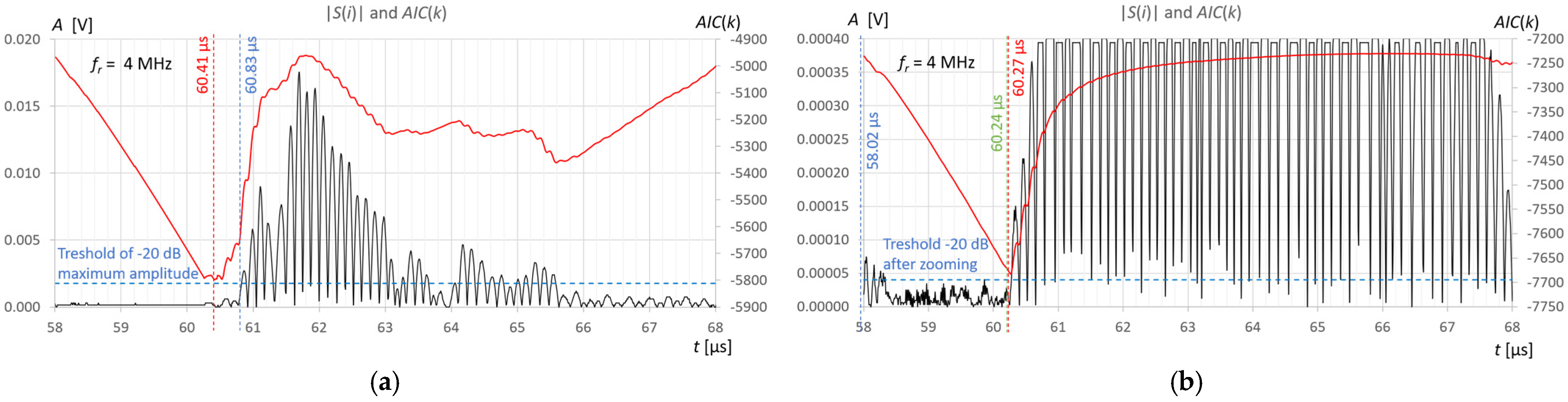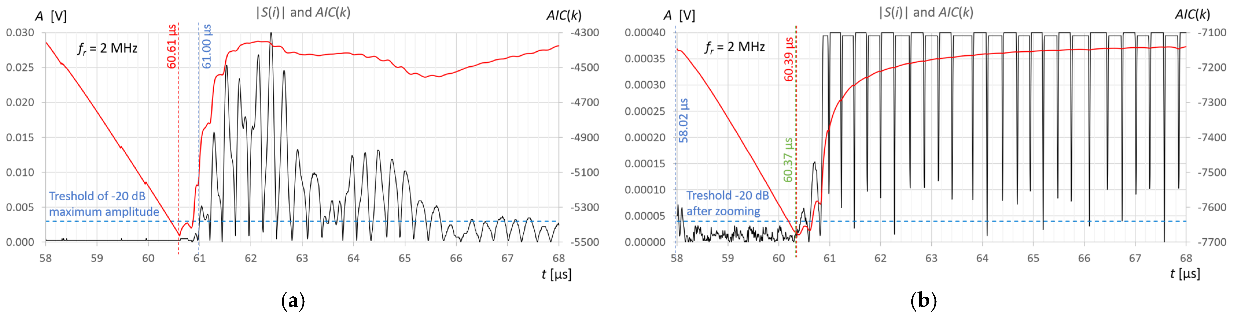 Figure 11b in the zoomed window, the result of the AIC measurement (red) almost coincides with subjective recognition of the pulse start (green); the differences of approximately 20–30 ns correspond to approximately two to three times the distance between the samples at the applied signal sampling frequency