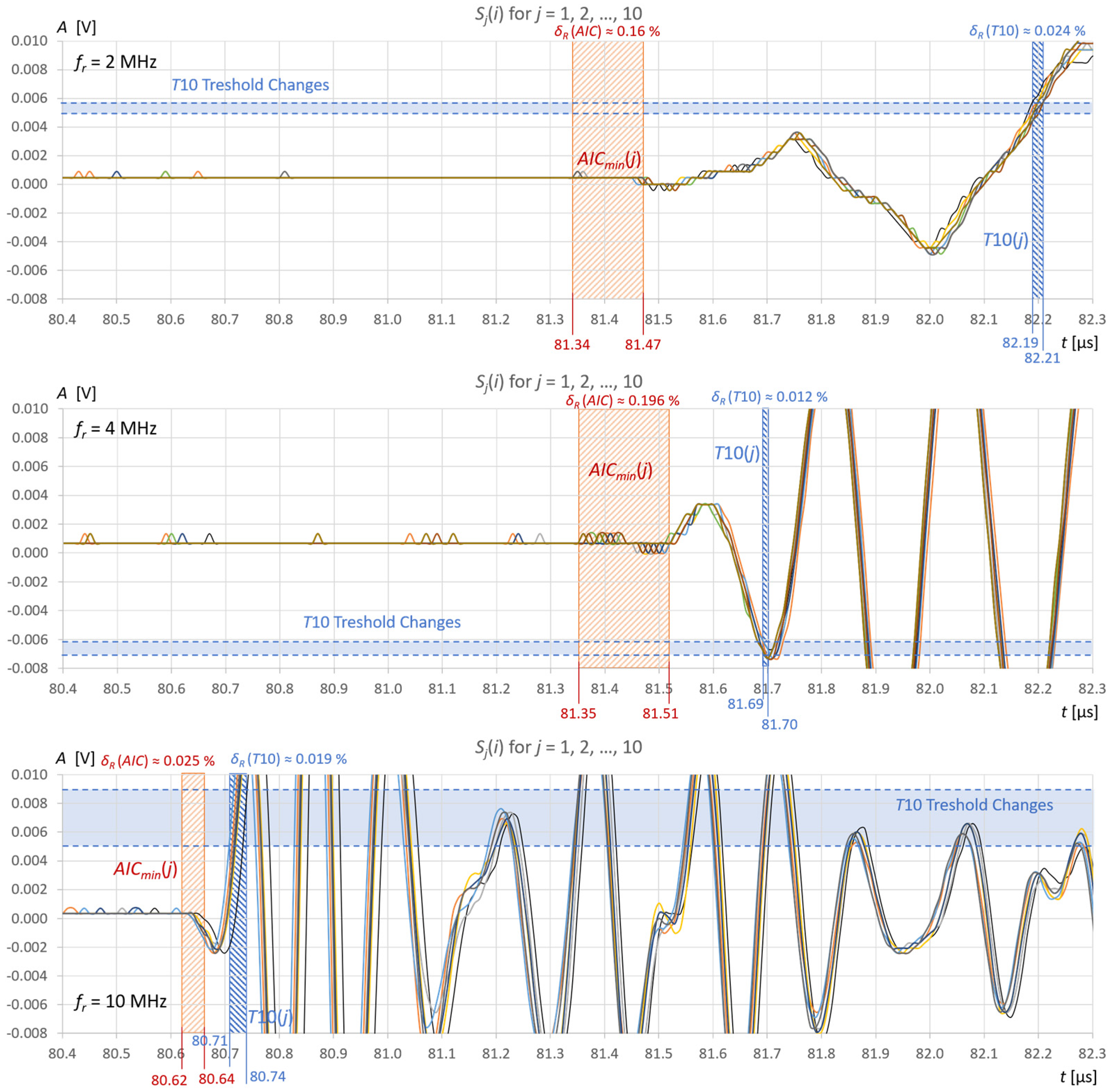 Figure 11b) by approximately 300–1600 ns, depending on the frequency of the probe used and the pulse shape. The fixed-fractional threshold method is sensitive to pulse rise time, unlike the AIC method.