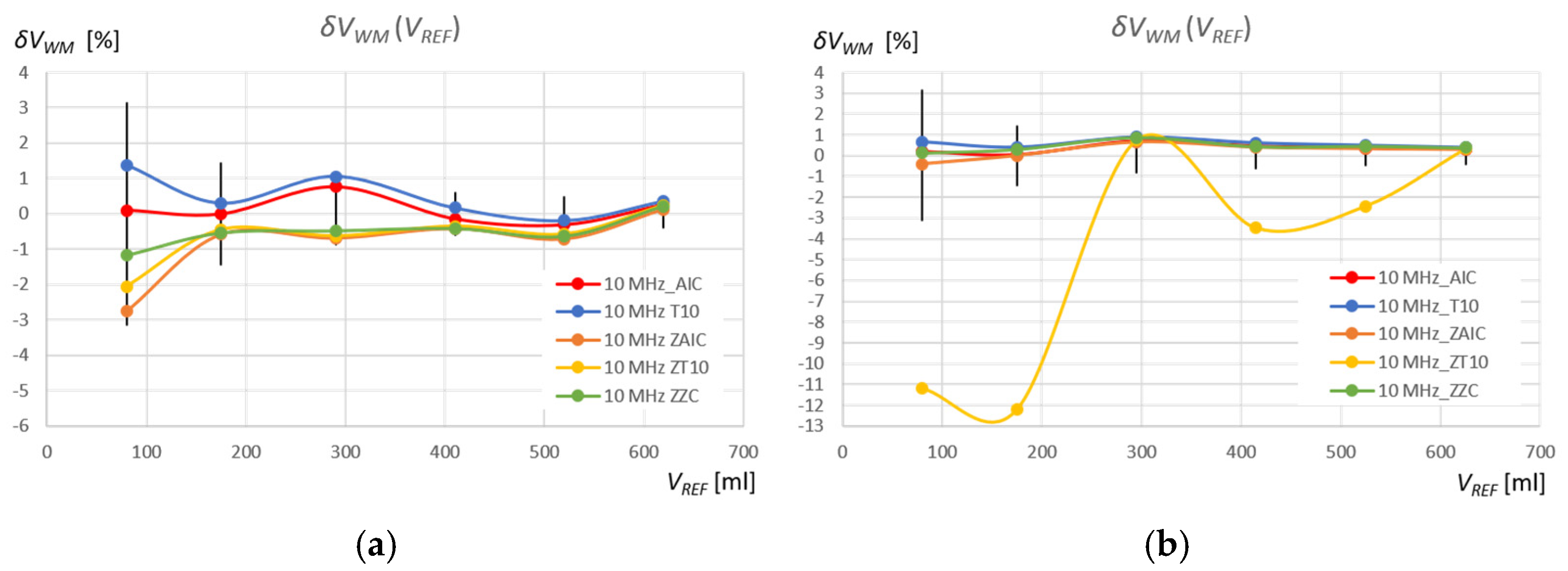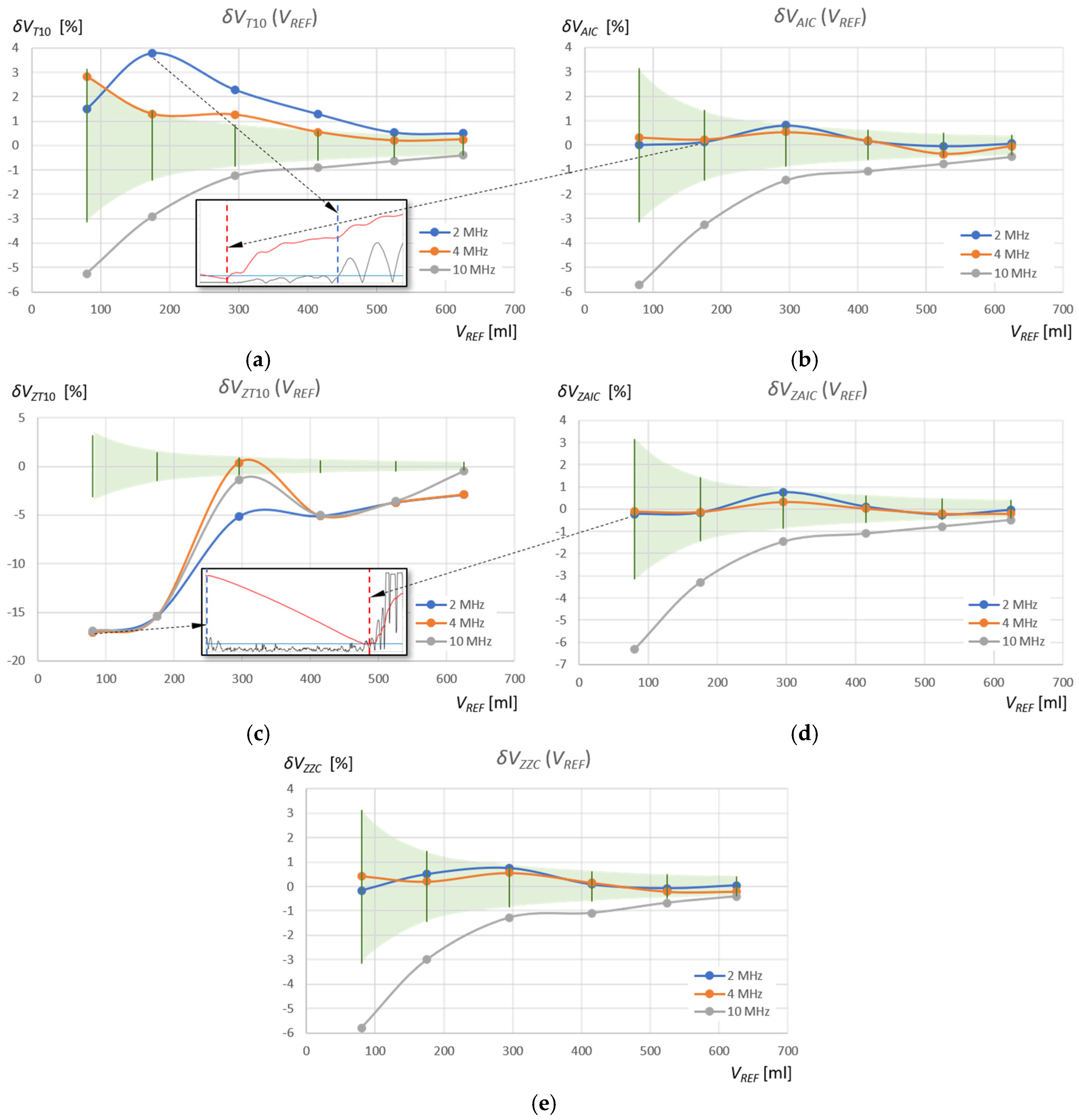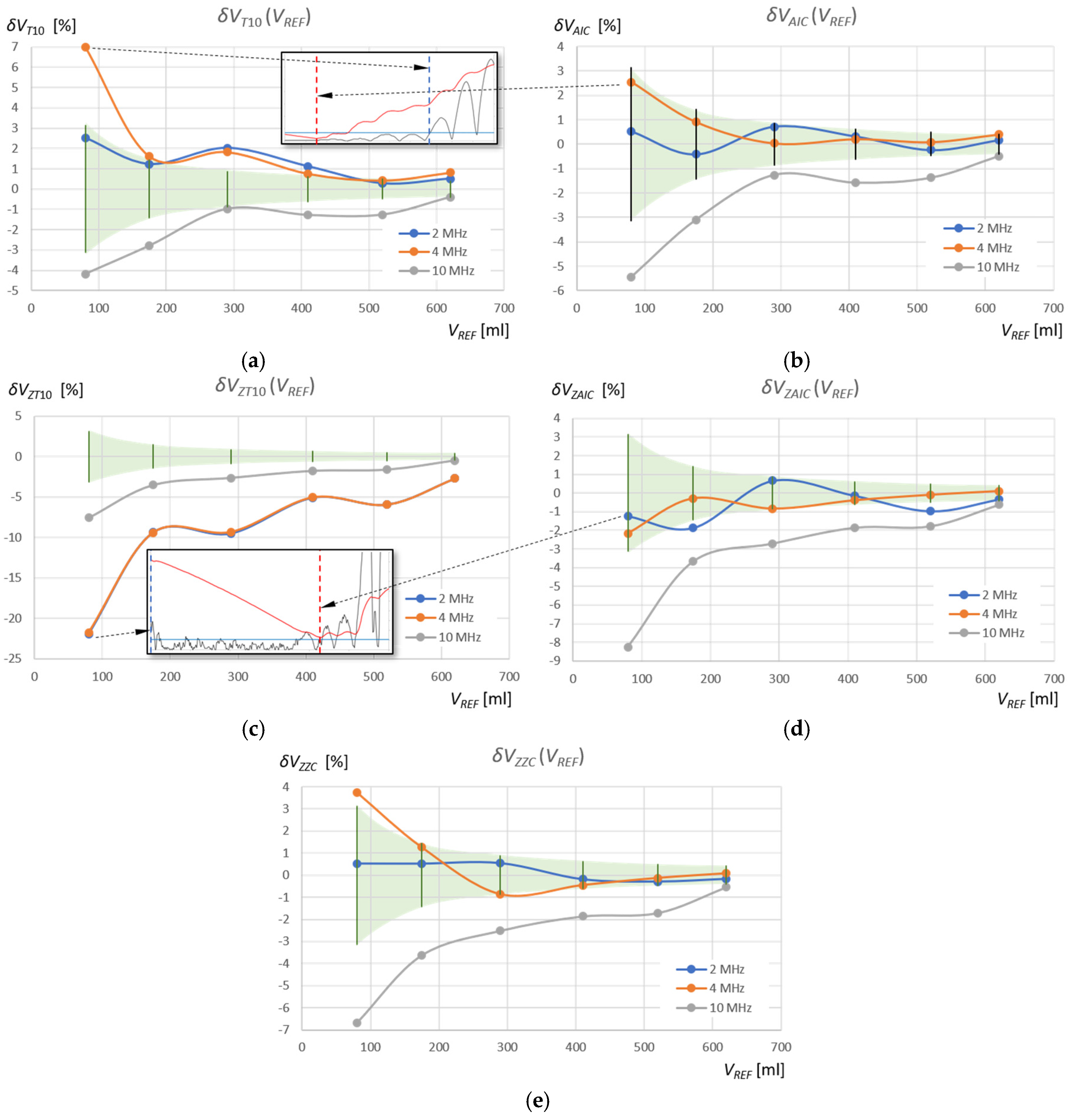 VREF = 80 mL. As can be seen, these errors are caused by a shift in the detection of the pulse start time as a result of a slow pulse rise time and initial pulse amplitudes below the detection threshold. Therefore, the water volume values measured using the T10 method for frequencies of 2 MHz and 4 MHz are overestimated. The AIC method detects the start of the pulse much more accurately by detecting its very small rise amplitude. In the zoomed measurement window, the errors
