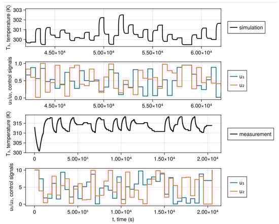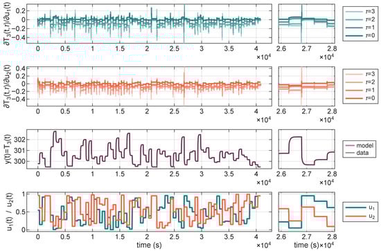 To calculate the sensitivity of the RNN, we calculate the gradient of the output of the model (temperature , being a scalar) with respect to the two input control signals and , using automatic differentiation. This way, we determine the influence of a change in input signals on the output value. Control signals may sometimes be affected by disturbances, so information about their sensitivity is essential. Automatic differentiation is a set of techniques that apply the chain rule for calculating derivatives of composite functions, which also applies to neural networks. In most cases, the gradient of a scalar loss function is calculated with respect to the network’s weights. In this case, the so-called reverse mode automatic differentiation needs only a single evaluation of the loss function to obtain all elements of its gradient with respect to the weights. On the other hand, a forward mode automatic differentiation (in general) requires as many evaluations as there are weights of the network. Most of the forward-mode automatic differentiation libraries are implemented based on a new datatype called dual numbers [] or its extension that allows tracking multiple derivatives with a single function evaluation, i.e., hyper-dual numbers []. In our research, we use the latter for tracking two perturbations for each of the two control signals related to the respective valves.