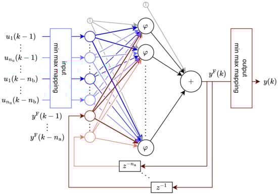 This network consists of three layers: input, hidden, and output. The input layer consists of two parts (in the figure, colored with different hues). The first one is connected to exogenous inputs of the model (blue hue in the figure), while the second one is connected to the feedback signal from the model’s output (red hue in the figure). It is essential to notice that in both cases, what actually reaches the input layer is a series of delayed signals, not only the last value for each signal. The hidden layer of this network consists of a number of nodes, each utilizing a sigmoid activation function: