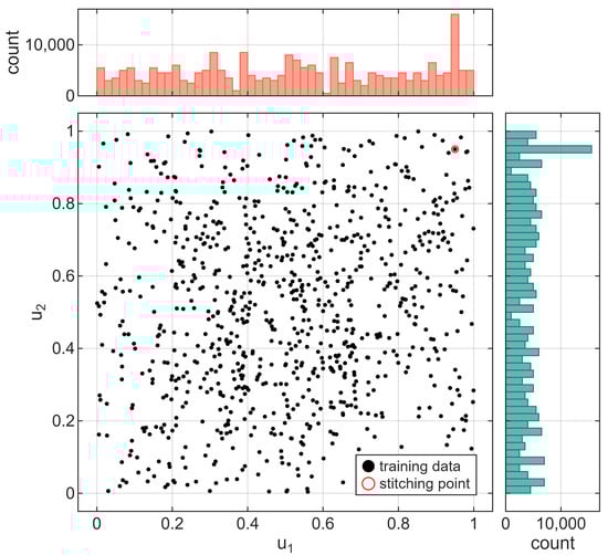 The training dataset should cover all representative samples of a state space to enable a proper generalization of a trained neural network. Building such a dataset is time-consuming, which is why we have generated the data with the help of the FVM simulation. To prepare such a vast dataset, we ran numerous simulations with random control signals on separate computing machines and then stitched the results into a single dataset. After each control change, there was sufficient time for the signal to stabilize (approximately 500 s), allowing the model to learn the static characteristics of the process. Also, the data were long enough to cover as much of the input signals’ range as possible – in total, the whole dataset consisted of almost 273 thousand samples, collected at a frequency of 1 Hz. Distribution of input signals for the training dataset is shown in Figure 4. In general, control signal values were generated as random steps from a uniform distribution; however, an increased number of samples for control signals can be observed in the histograms. To allow seamless stitching, each dataset started and ended at the same operating point, resulting from the aforementioned control signal values, which, in turn, visibly influenced the histogram, as shown in the figure.