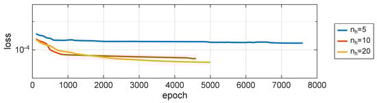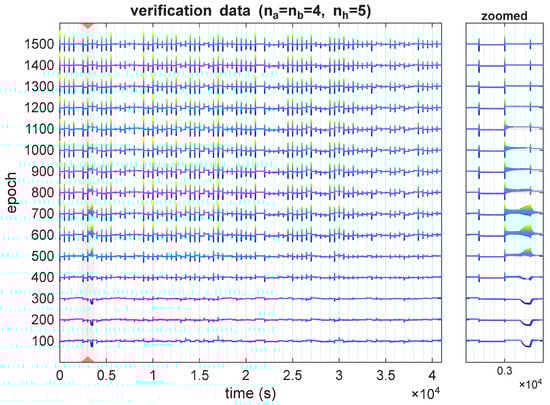 During this research, we have also explored the influence of dynamic orders on the neural network model’s sensitivity, specifically testing and . Models with have not manifested more extended periods of time of rapidly changing sensitivity that have been seen for undertrained models with . Models with have also been susceptible to such extended time periods of significant sensitivity. Otherwise, all the observations that were presented earlier for have been repeated for those structures as well.