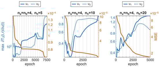 We have compared the MSE values with the maximum values of sensitivity with respect to both delay and time for consecutive epochs of training; the results are displayed in Figure 9. It can be observed that as the value of MSE decreases, the maximum value of sensitivity increases for both input signals of the model. Although the relation is not linear, the overall trend seems to be consistent.