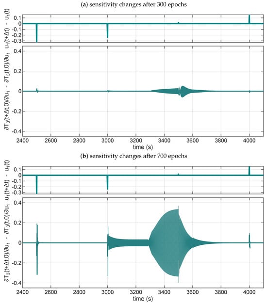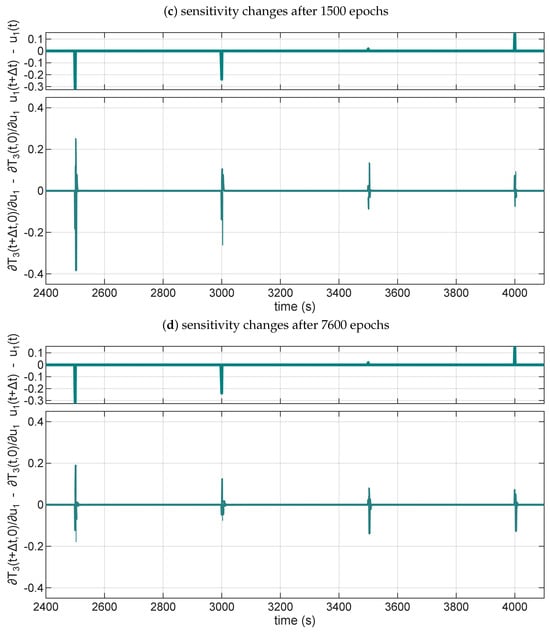 At the beginning of the training, after only 300 epochs, Figure 11a presents that the model lacks the proper sensitivity at control switching time instants. Moreover, a growing sensitivity change before t = 3500 s is an indication of low robustness, as the change does not correspond to the physics of the process. Figure 11b shows that after 700 training epochs, the sensitivity to control switching is properly recovered; however, the sensitivity change grows even faster between t = 3000 s and t = 3500 s, which again signals that such a model is not robust. The NARX model is robust, as can be seen in Figure 11c, after training it for 1500 epochs. The sensitivity is constant between the control signal changes every 500 s. Figure 11d shows that the model, after 7600 epochs, remains robust, and its sensitivity continues to adjust during the training process.