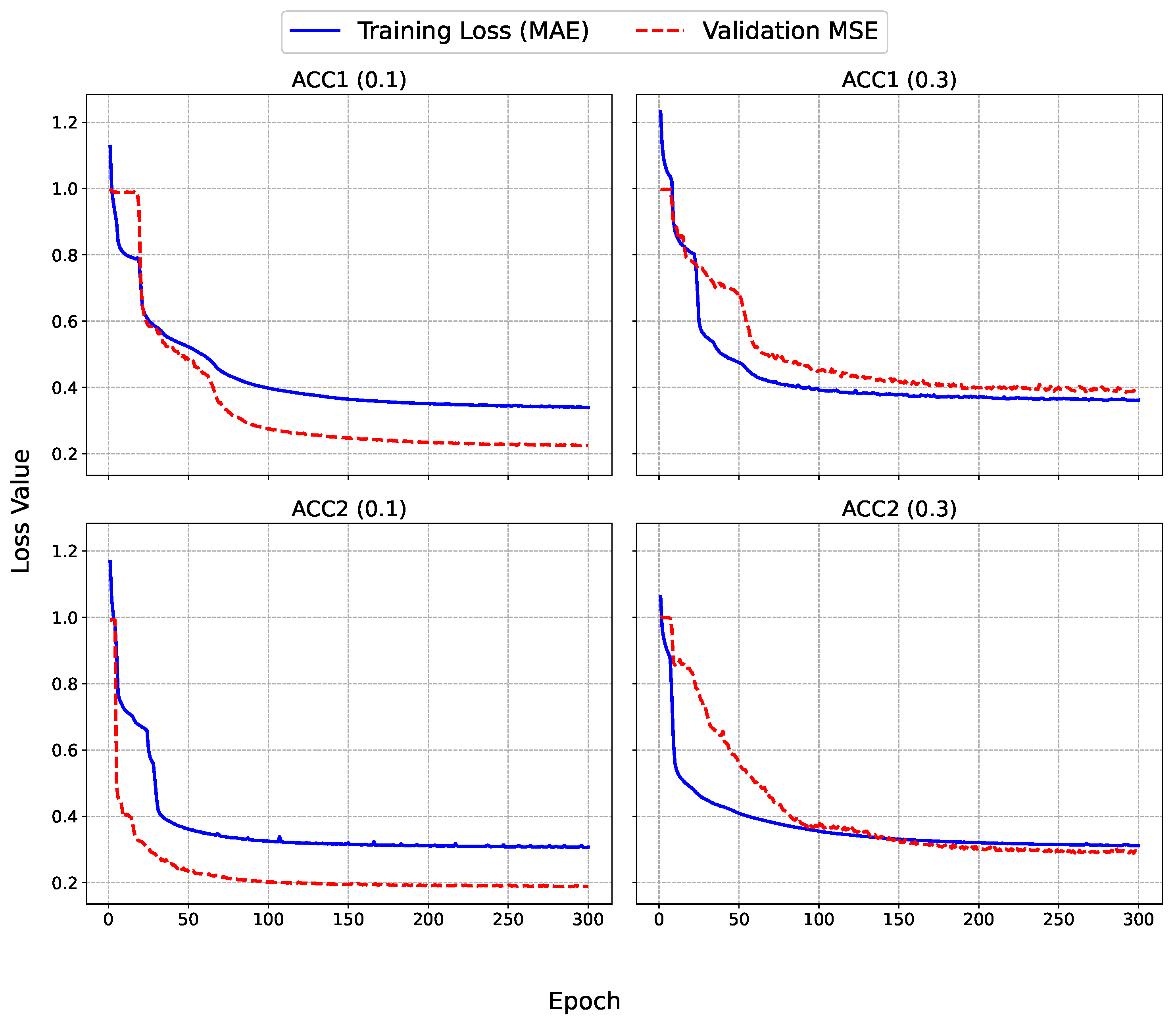 Figure 5. These graphs illustrate the evolution of the training loss (MAE, computed on the imputed values relative to the ground truth) and validation MSE over 300 epochs for accelerometer datasets (ACC1 and ACC2) and up to 500 epochs for the microphone dataset (MIC). MAE was used for the training loss due to its robustness to outliers, while MSE was used for validation to heavily penalize large errors during hyperparameter selection. The training MAE decreases rapidly in the initial epochs (typically within the first 50), indicating an efficient capture of the underlying patterns in the time series. This is followed by a gradual plateau, suggesting convergence without signs of overfitting, as the validation MSE closely mirrors the training trajectory without upward divergence. For lower missing factors (0.1), the curves exhibit smoother and faster stabilization, with final validation MSE values around 0.2–0.25 for ACC datasets and 0.3 for MIC, to reflect the model proficiency in handling short gaps. In contrast, at higher missing factors (i.e., 0.3), the validation MSE shows slightly more oscillations early on, stabilizing at higher levels (0.4–0.7), which aligns with the increased challenge of imputing longer blocks. Notably, the univariate MIC dataset displays greater volatility in validation loss for the 0.3 case, underscoring the benefits of multivariate contexts in ACC datasets where cross-feature dependencies aid imputation.