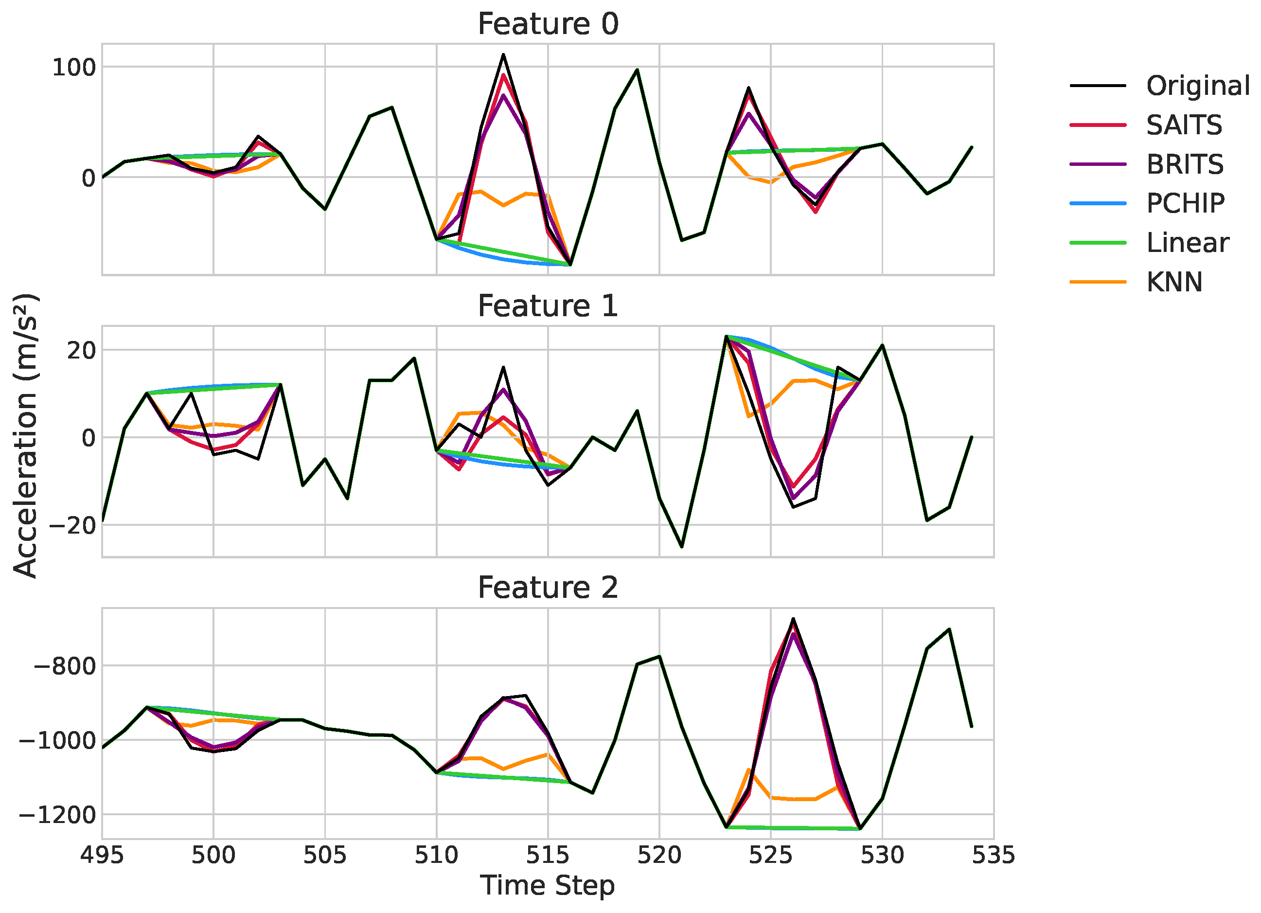 Table 5 reaffirms the trends observed in ACC1, further solidifying the SAITS model superior imputation performance across the diverse sensor datasets. SAITS consistently delivered the lowest errors regarding all the metrics, enabling highly accurate signal reconstruction, as evidenced by its near-perfect Sim scores of 0.96, 0.74, and 0.98 for features 0, 1, and 2, respectively, alongside low MAE values ranging from 4.81 to 14.72.