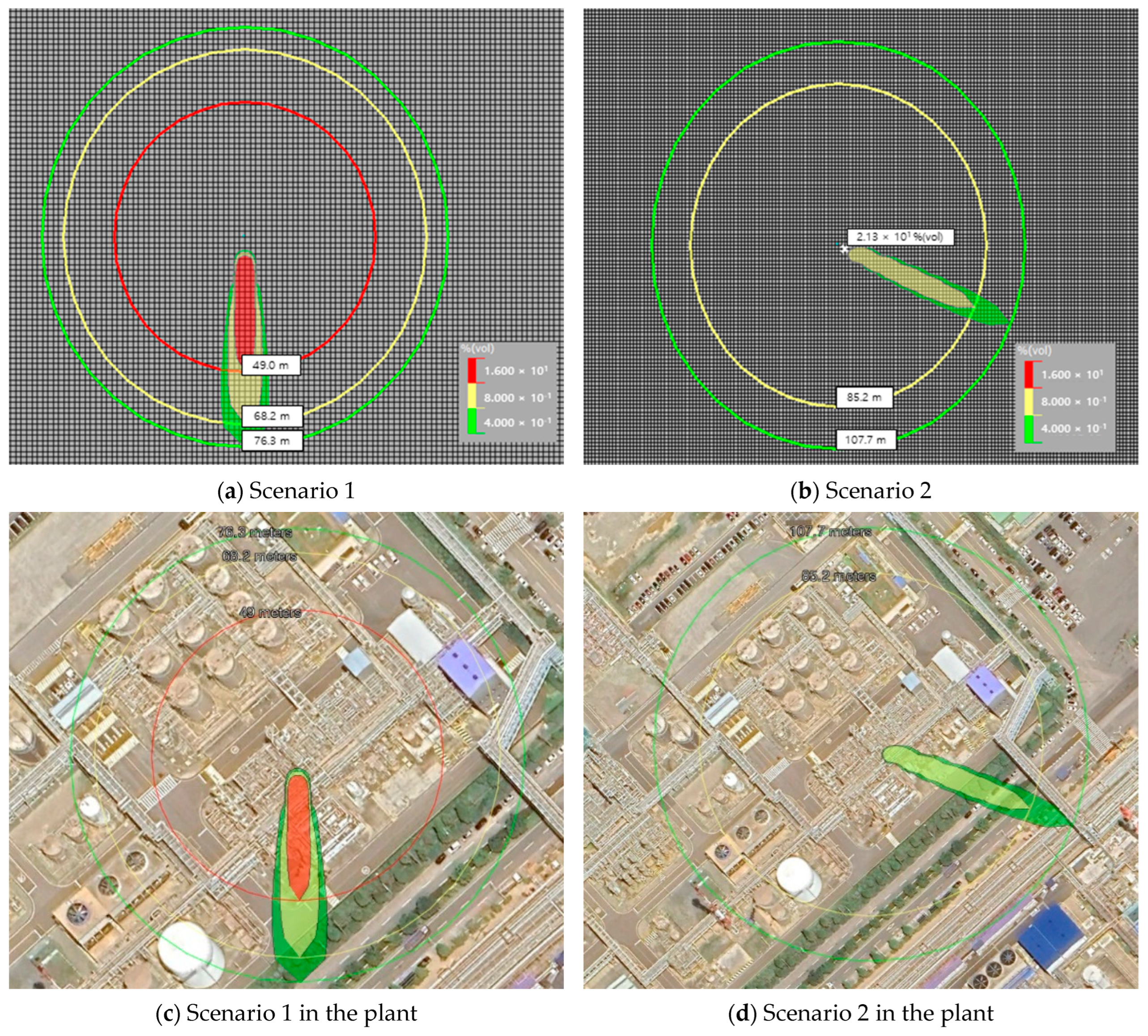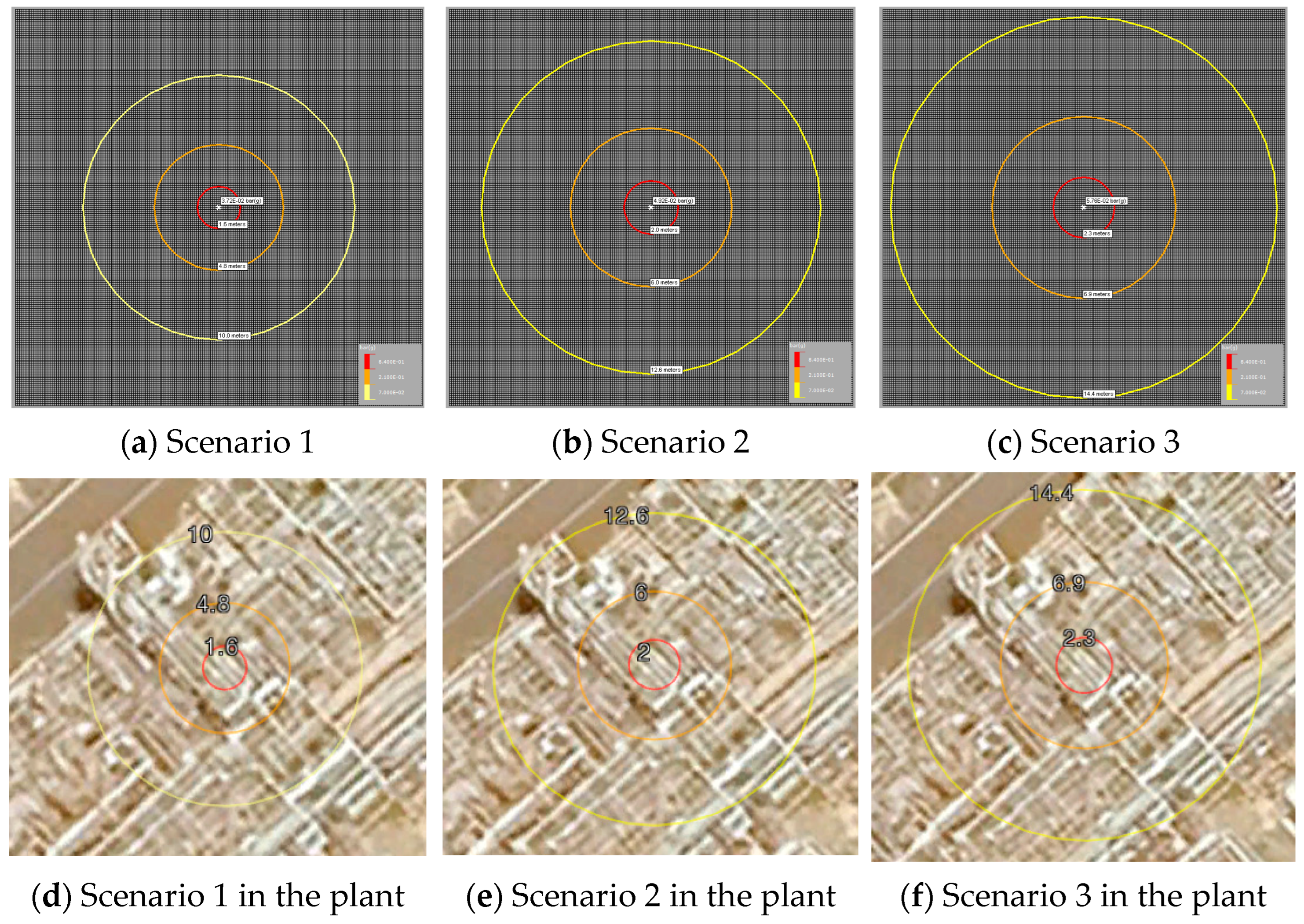 35]. Based on the VCE analysis, it has been determined that under various conditions, the force generated by an explosion that can break windows can cause damage up to a distance of 10 m. Additionally, enough force that can cause equipment damage can destroy nearby objects within a distance of 1.6 m. The explosion in Scenario 3 was found to cause damage up to a distance of 14.4 m. The explosion ranges for each scenario are summarized in