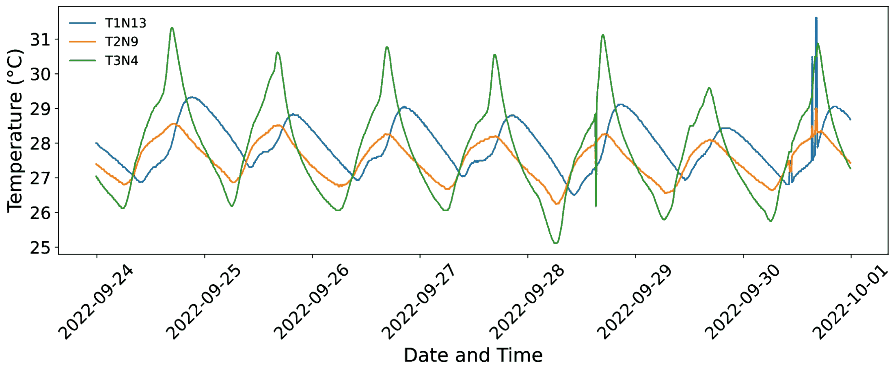 Figure 3 is an example of a one-week period (24 September to 1 October 2022) chosen to show in more detail how the behavior evolves during the experiment. The diagram illustrates temperature differences between various depths, elevations, and orientations of the trunk. While the sensors are relatively parallel and have similar trends overall, it is evident that thermal responses are affected by depth of burial, exposure, and external weather conditions.