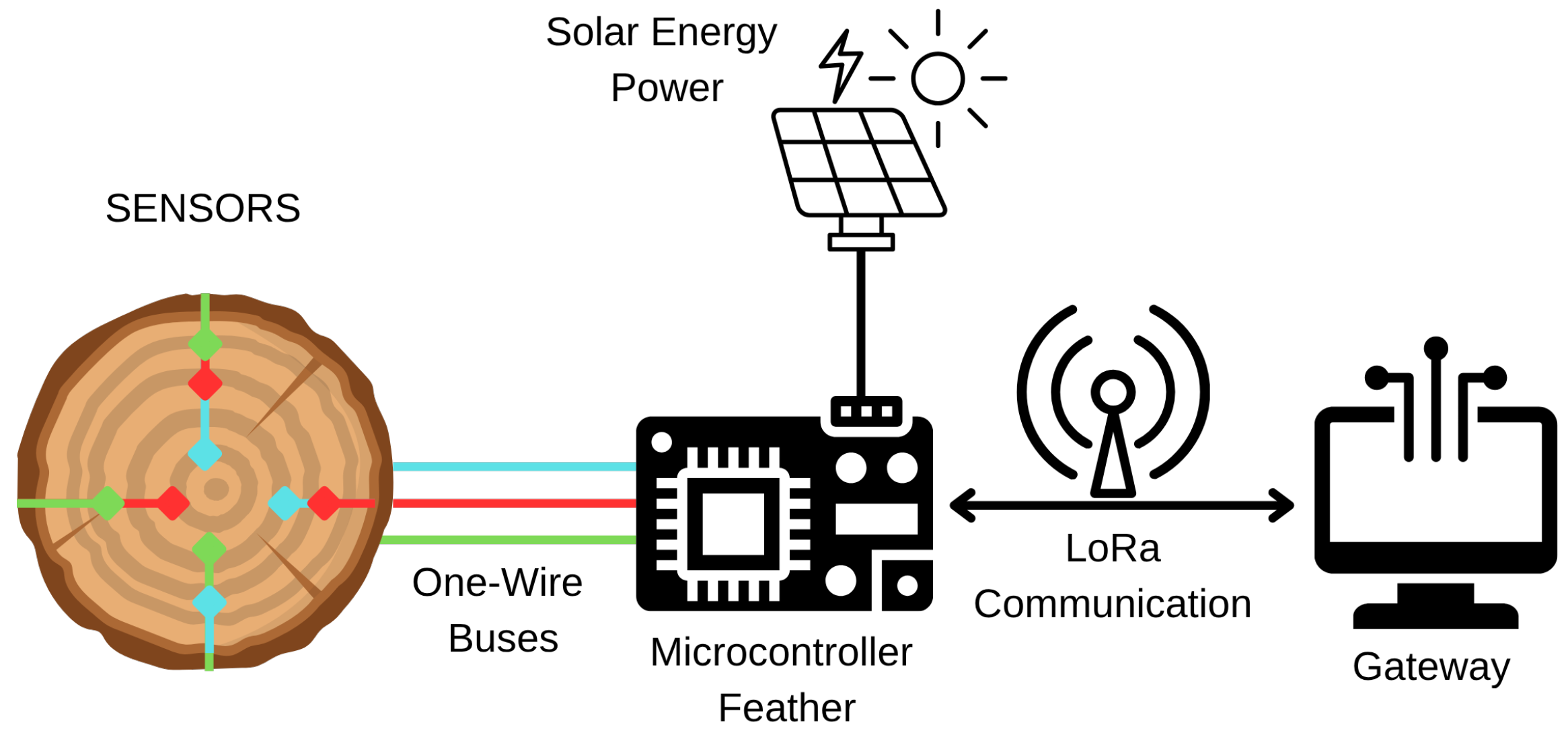 The overall system architecture for monitoring tree trunk temperatures and uploading them to the cloud is depicted in