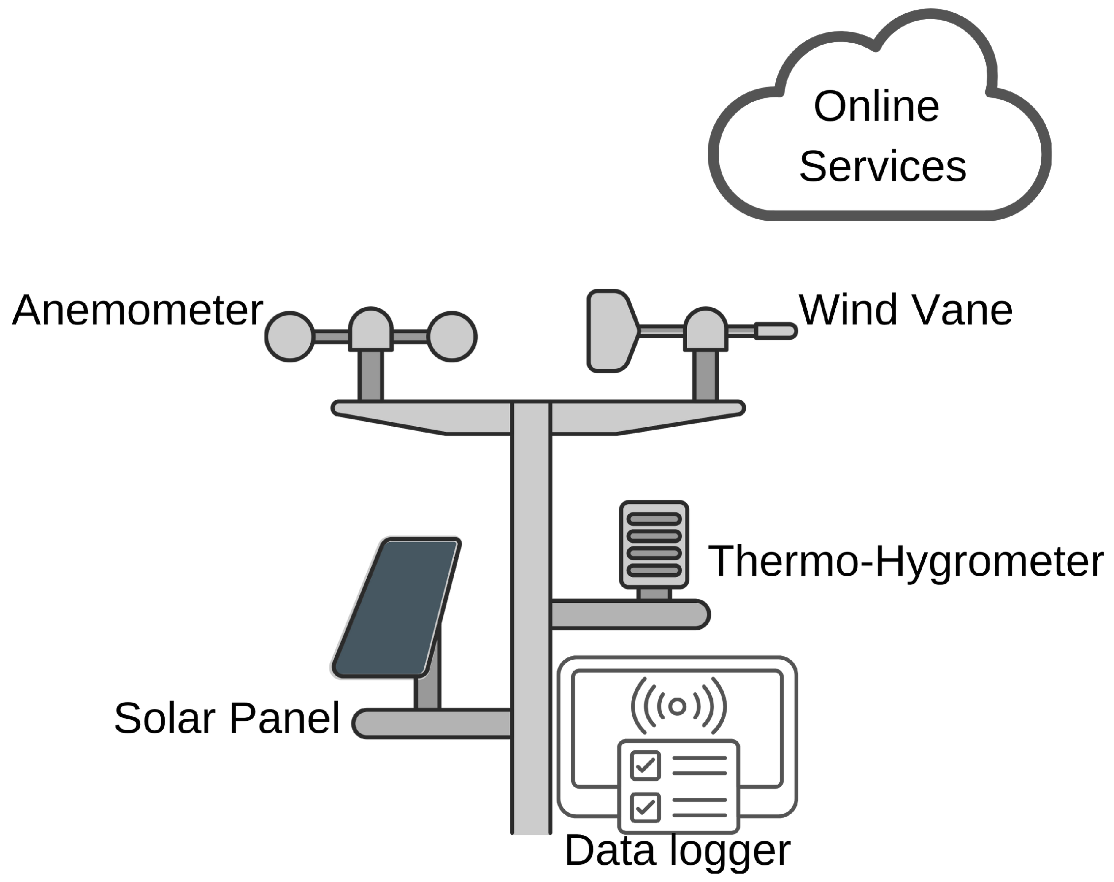 In this respect, two elements from the automatic weather station are particularly relevant to our work: the anemometer (to measure wind intensity) and the wind vane (for wind direction), as depicted in
