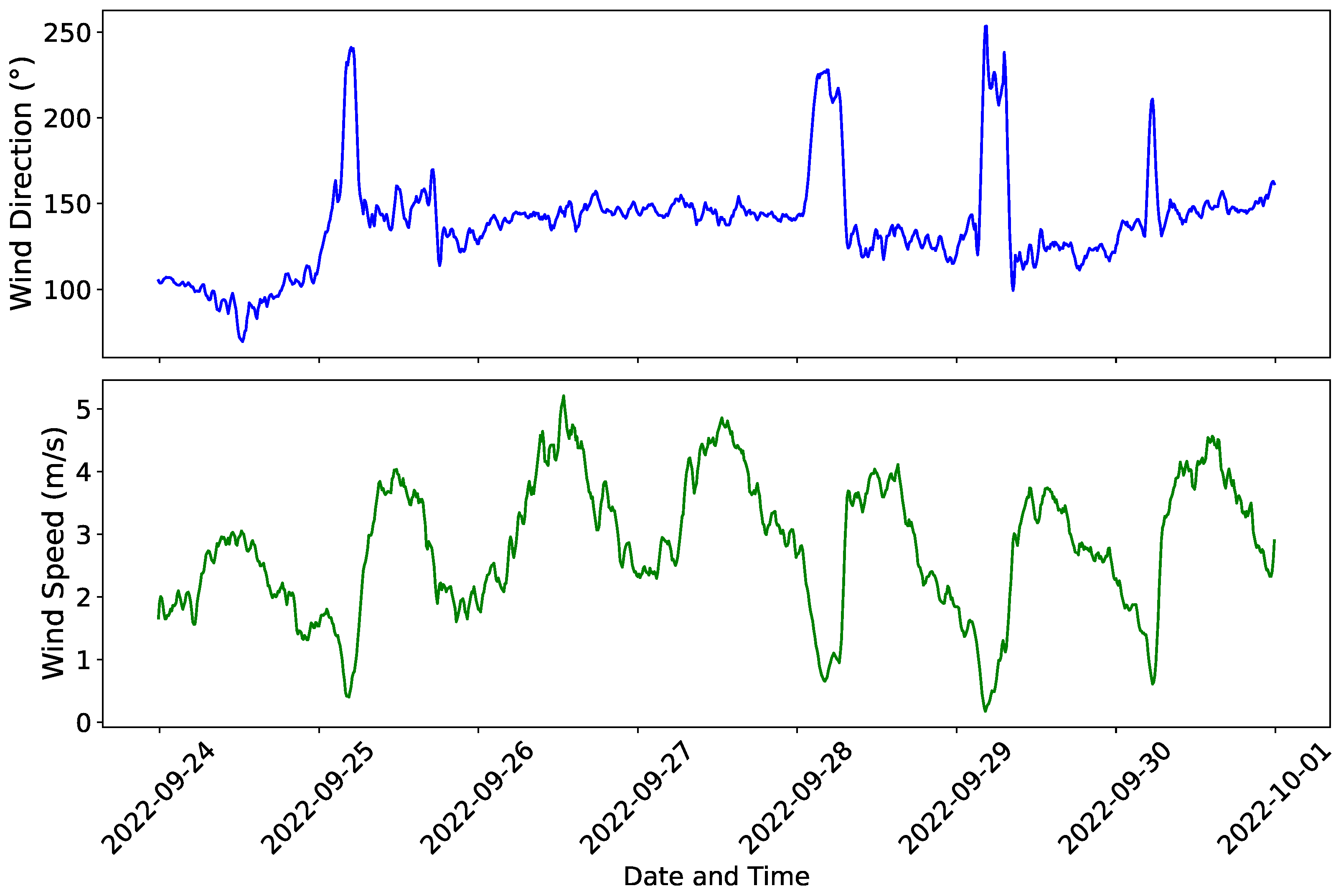 The wind direction (upper graph) and the wind speed time series (lower graph), measured by CEAR/UFPB meteorological station, during a typical one-week period of days [from September 24 to 1 October 2022], are presented in