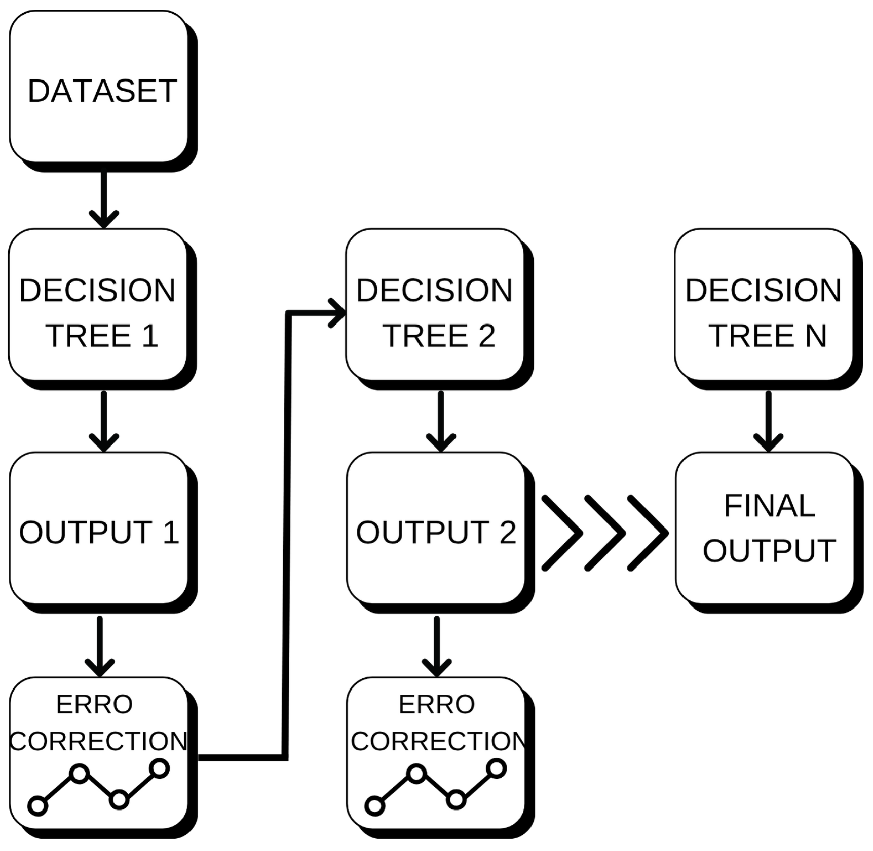 GAn example of this kind of learning would be Gradient Boosting (GB), which is also using decision trees as its base classifier; however, GB learns the model in an iterative way unlike RF. The construction of every tree is done by looking at the remaining errors after iteration up to that point of the ensemble and in a way that reduces them, (this process takes place following the negative gradient of the loss function [