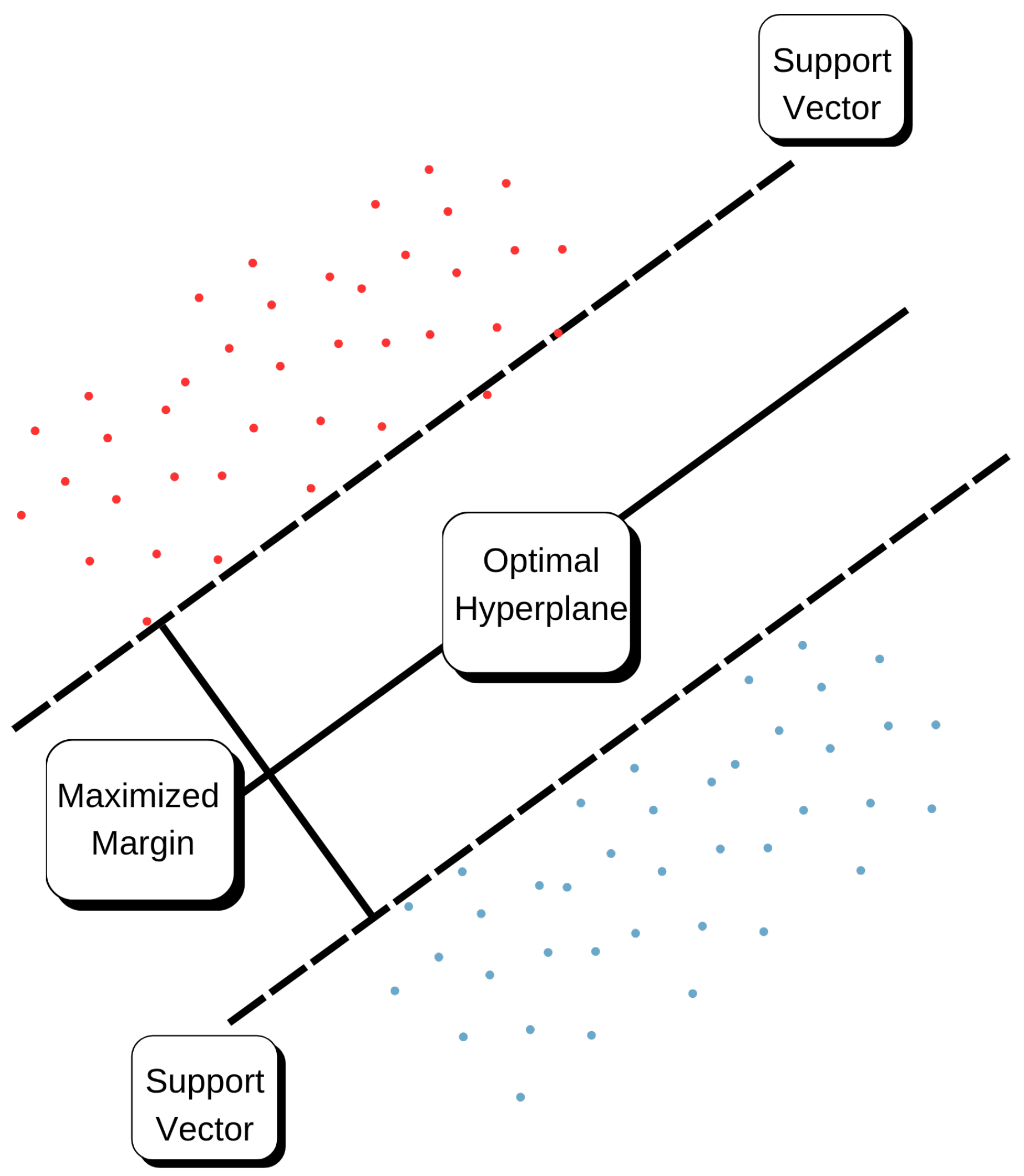Here, is a kernel function that lifts input data into a higher dimensional feature space, w is the weight vector, and b is the bias term. The model complexity is determined by the regularization parameter, C, which tunes the trade-off between how flat (i.e., how large margin) our model should be and how much errors we are willing to tolerate.