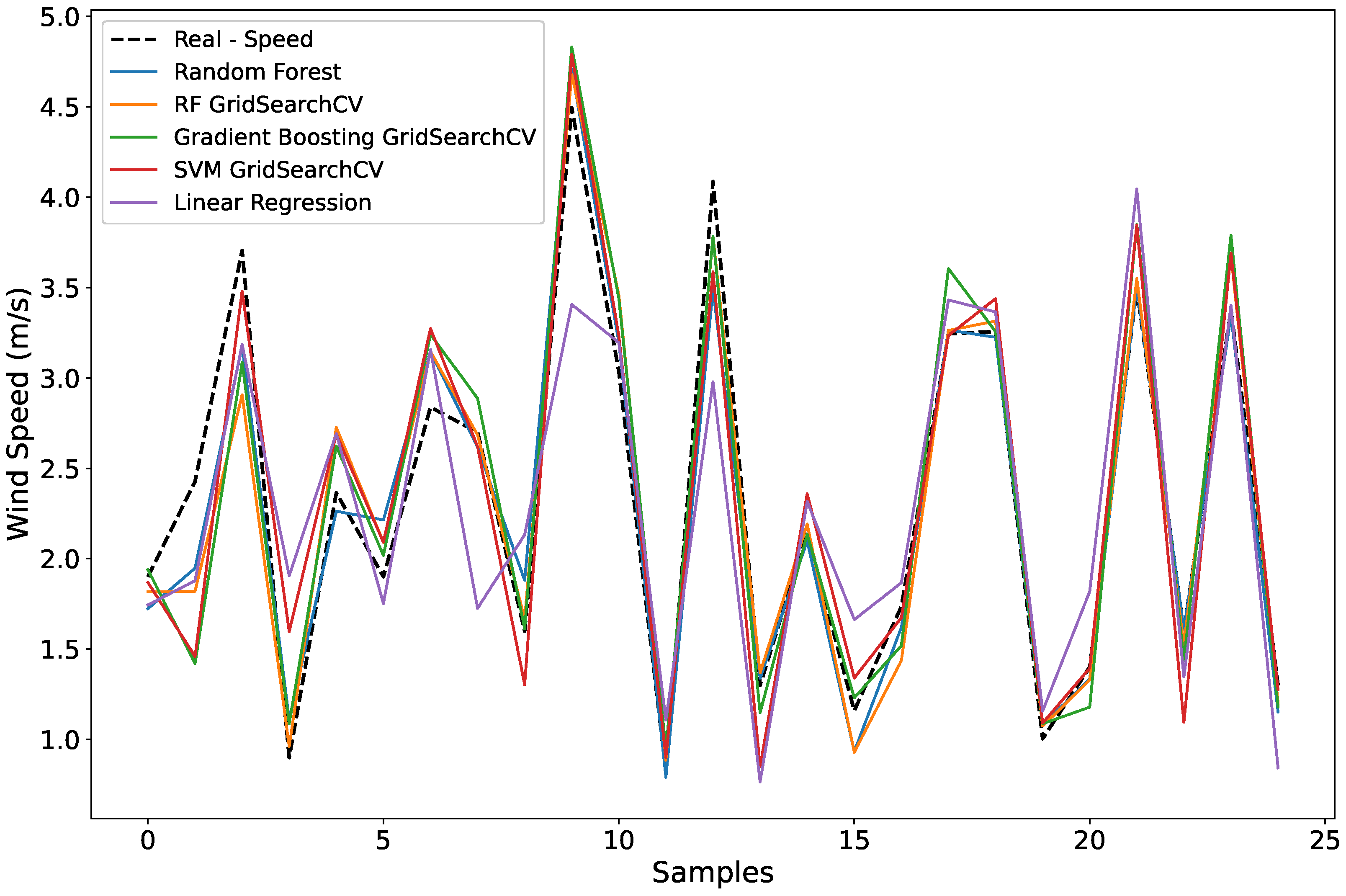 Figure 14 shows the comparison between predicted and observed wind speeds. The graph was adjusted to display only 20 samples, making it possible to perform an approximate visual analysis. The optimized RF reproduced the real variations more accurately, including during moments of abrupt changes, while the other models presented predicted values that were higher, lower, or smoother compared to the real data.