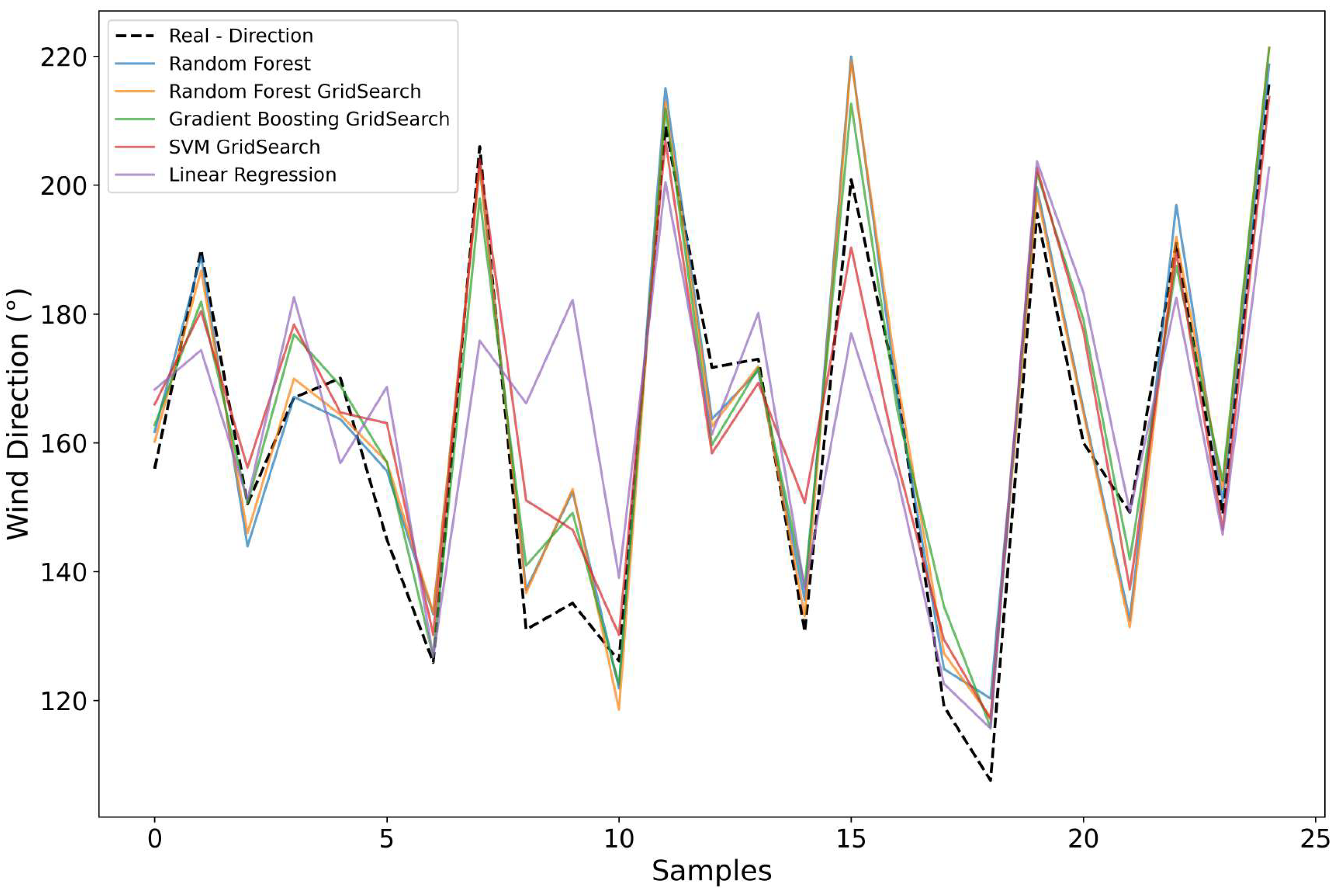. This result is considered relevant when taking into account the complexity of the problem, since wind direction has an angular and discontinuous behavior, which reduces the stability of predictions. The performance achieved by the RF can be attributed to the ensemble averaging mechanism, ensuring greater resistance to noise and multicollinearity, as discussed by Aminuddin et al. [