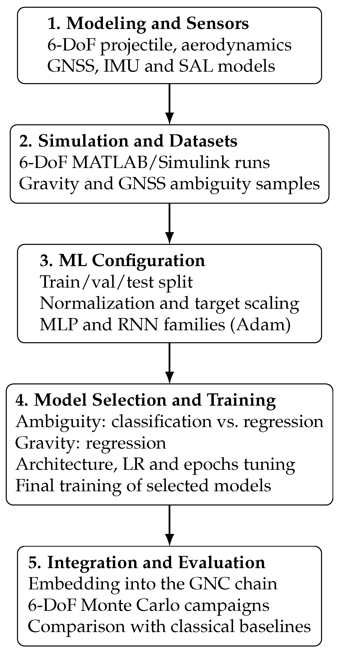 The remainder of this article is structured as follows. Section 2 presents the mathematical formulation underlying the projectile dynamics, sensor models, and the estimation problem. Section 3 introduces the proposed neural network architecture, detailing the network design, training strategy, and loss functions used for joint attitude, LOS, and GNSS ambiguity estimation. Section 4 describes the complete simulation environment and experimental setup, including the MATLAB/Simulink R2024b 6-DoF model and the procedures used to generate the training and validation datasets and reports the results of the Monte Carlo campaigns and compares the performance of the proposed framework against classical baselines. Finally, Section 5 summarizes the main contributions and discusses potential avenues for future research. To provide a clear overview of the methodology and to help readers navigate the transition from the theoretical formulation to the experimental implementation, Figure 1 presents the complete workflow of the proposed framework. The diagram summarizes all major steps of the study, from the mathematical modeling and dataset generation to the machine-learning procedure, model selection, and final integration within the GNC system.