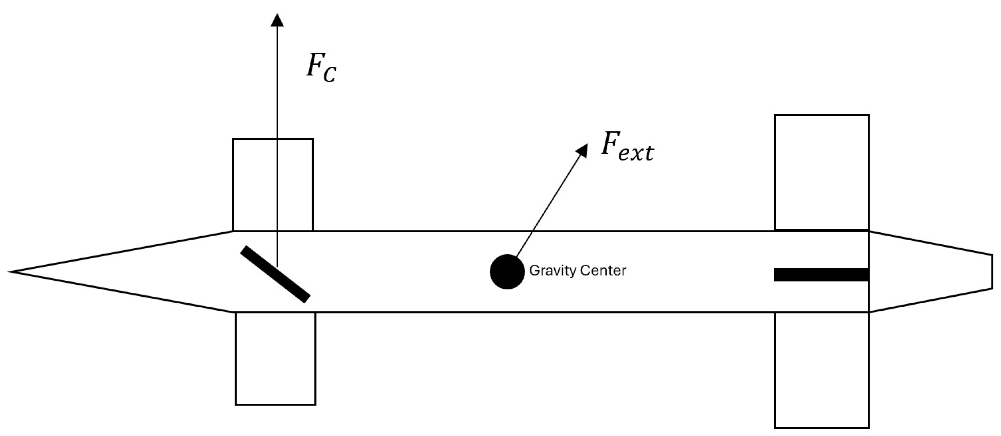 The proposed GNC strategy is implemented on a guided rocket equipped with a maneuvering assembly consisting of four forward-mounted canard control surfaces. These canards are mechanically isolated from the main airframe, allowing independent roll control of the forebody. A canard, in aeronautical terms, refers to a small lifting surface located ahead of the main wing, primarily intended to enhance stability and maneuverability, often substituting the conventional horizontal tail. In this configuration, the canard pairs are operated in a differential manner—two by two—to generate the desired control forces and the corresponding aerodynamic moments required for attitude regulation. Figure 2 clarifies the configuration of the vehicle. The forces depicted in the figure are described later in this section.