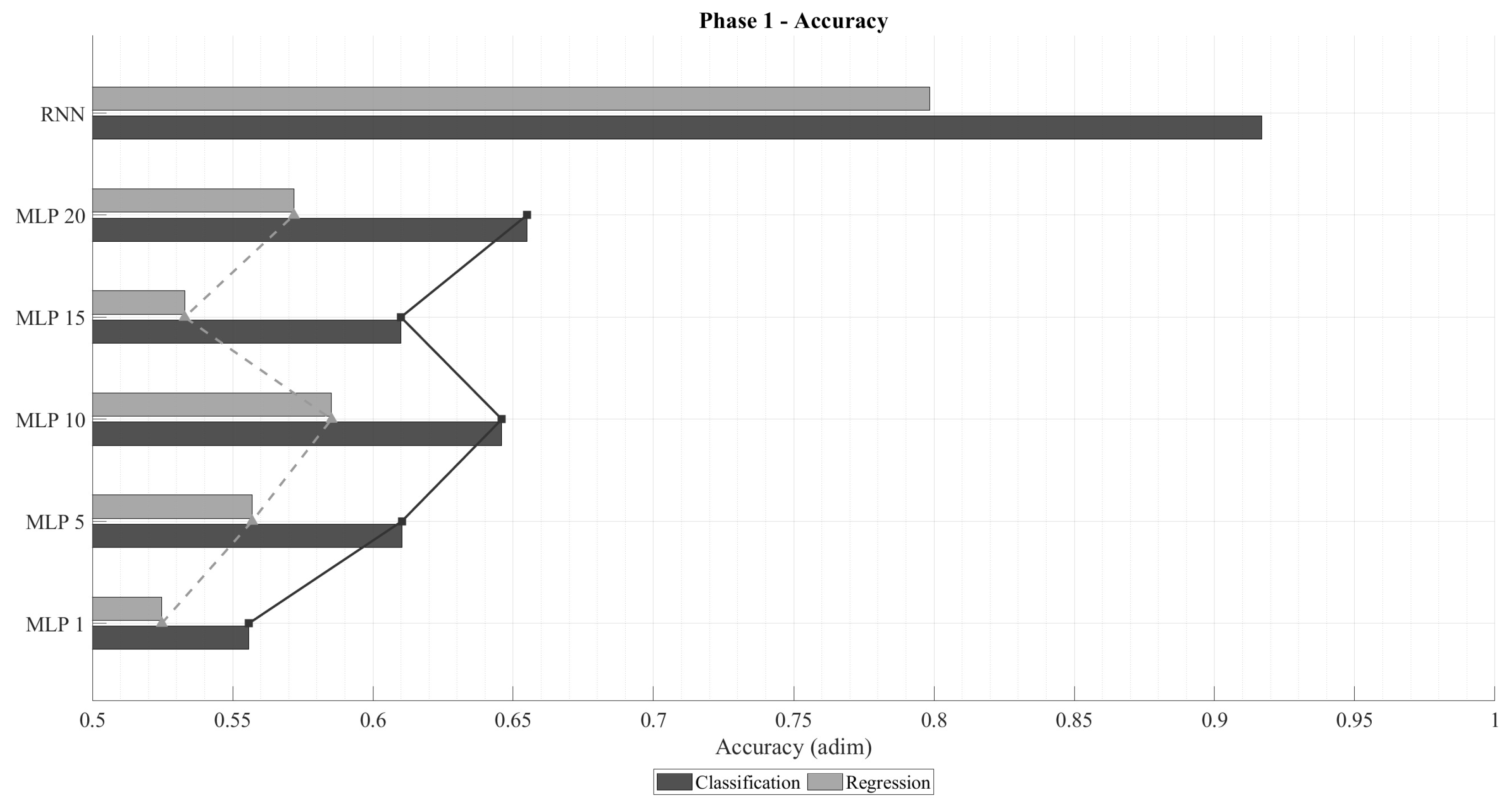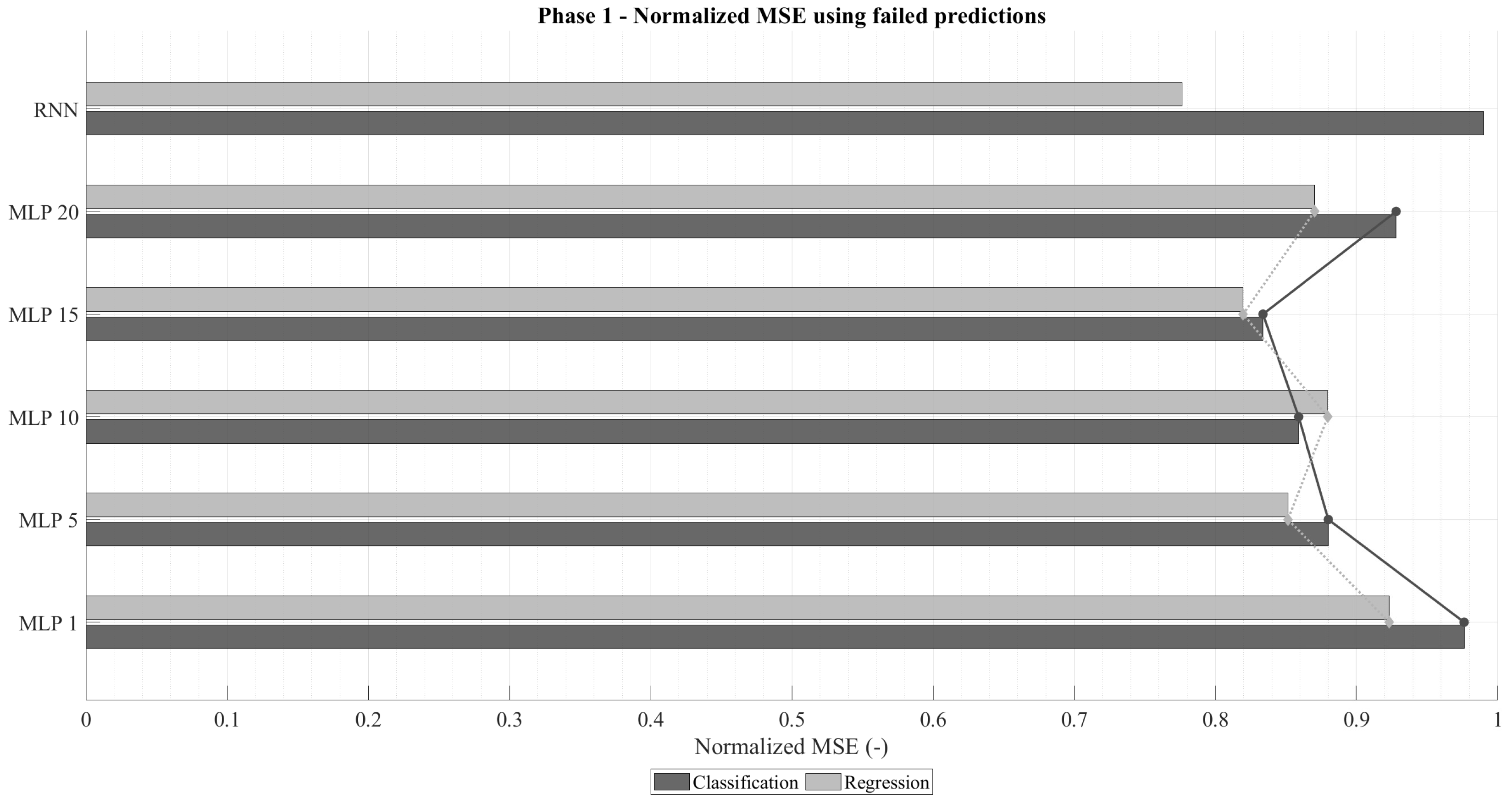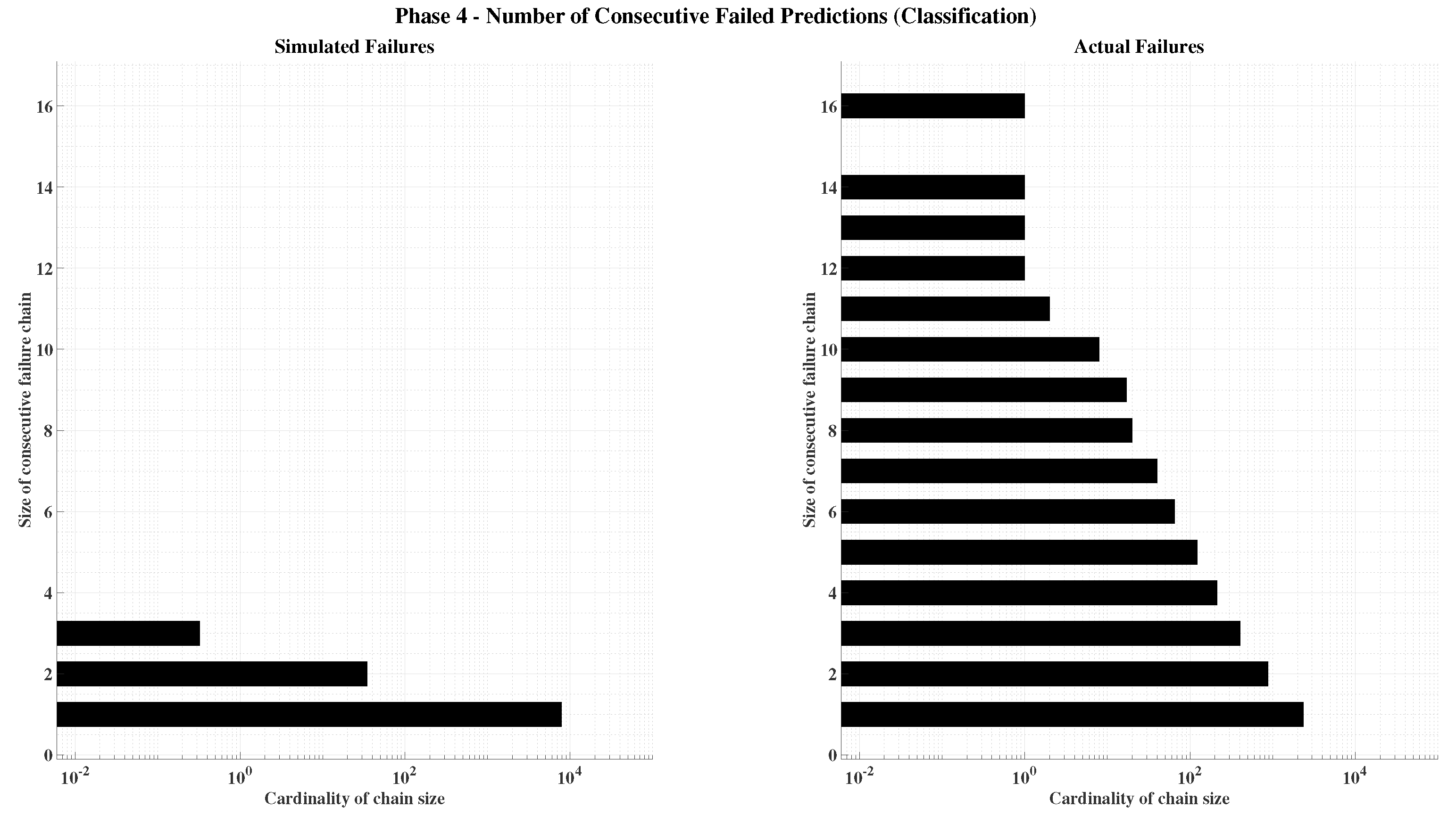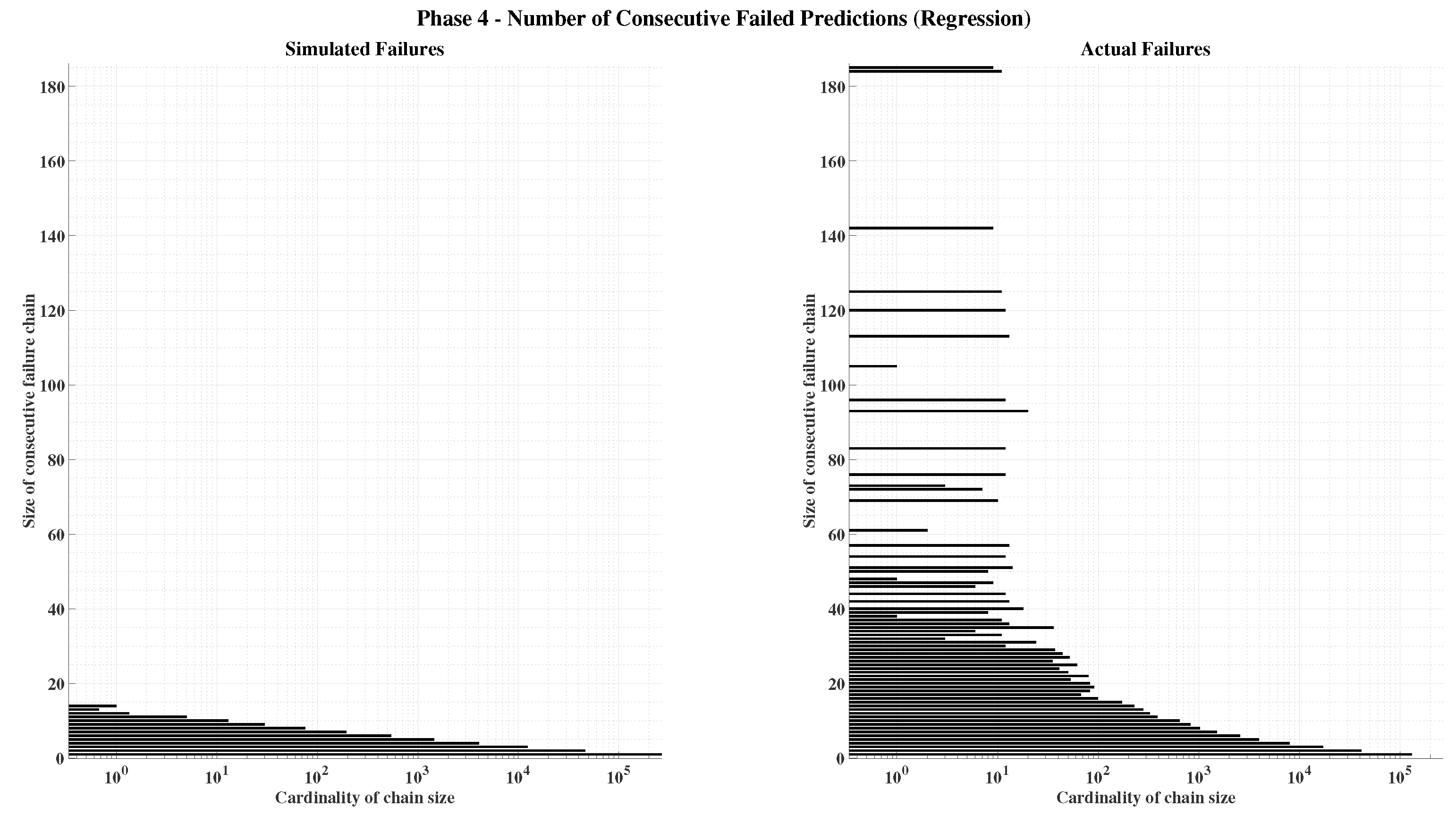 As shown in Figure 12, the simulated classification data display a greater number of isolated failures (single events uncorrelated with neighboring time steps) compared with the real model outcomes. However, the actual model produces larger and more diverse failure clusters—up to 16 consecutive time steps— whereas the randomized data rarely exceed four. A similar yet more pronounced behavior appears in the regression models (Figure 13), reflecting their lower overall accuracy. Empirically, this confirms that the conditional probability of failure given a previous failure is higher than the probability of failure given a previous success, i.e., . This observation is consistent with the temporal nature of RNNs, where consecutive inputs are similar and thus yield correlated prediction outcomes. It should be noted, however, that in a Simple RNN architecture, the recurrent connections propagate processed input information— not previous prediction errors—between consecutive time steps.