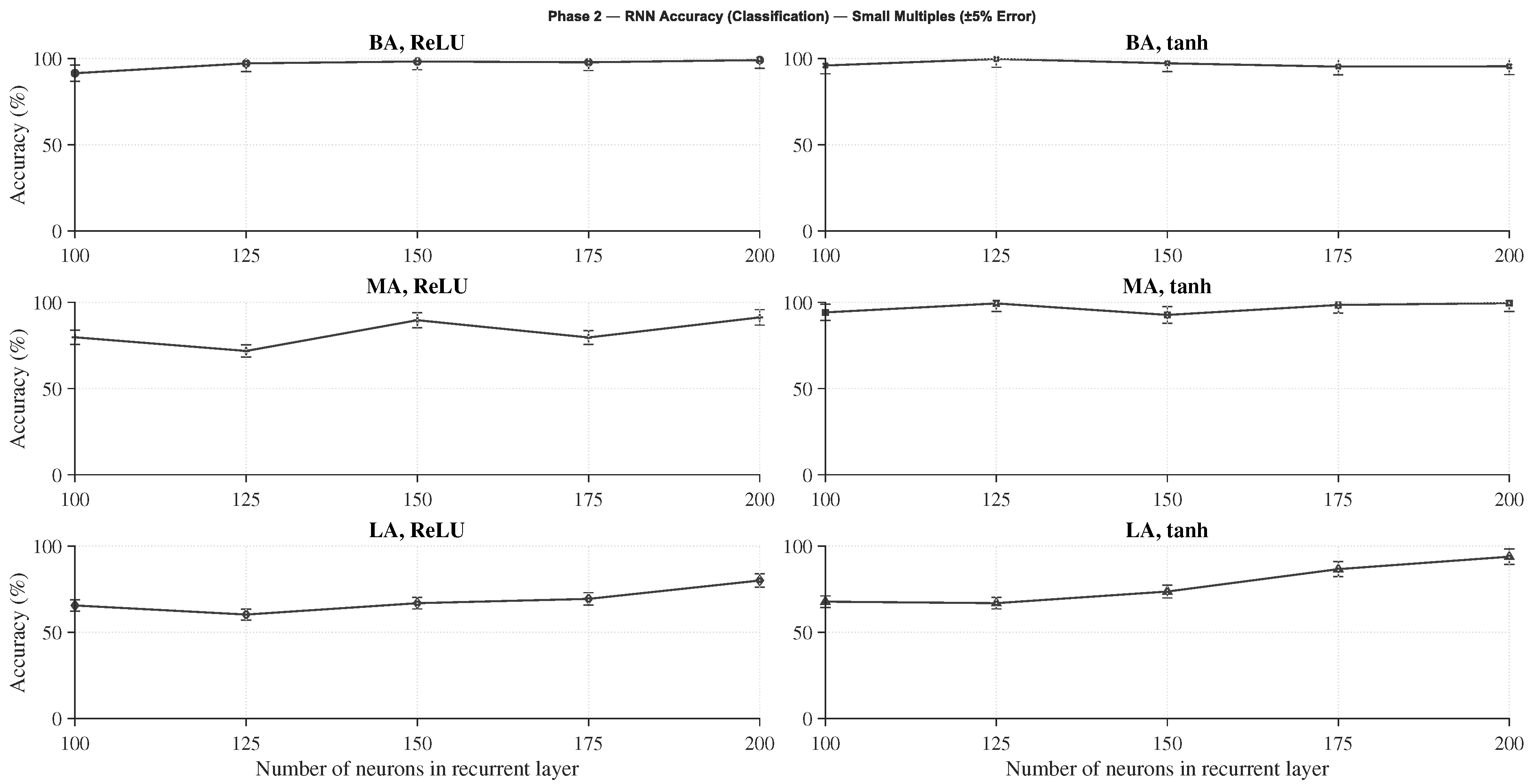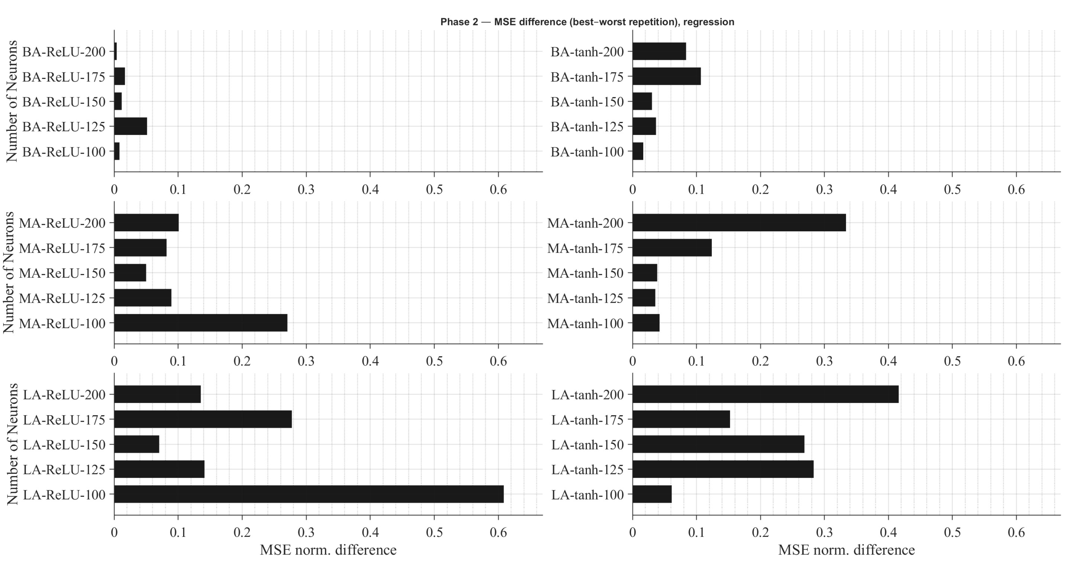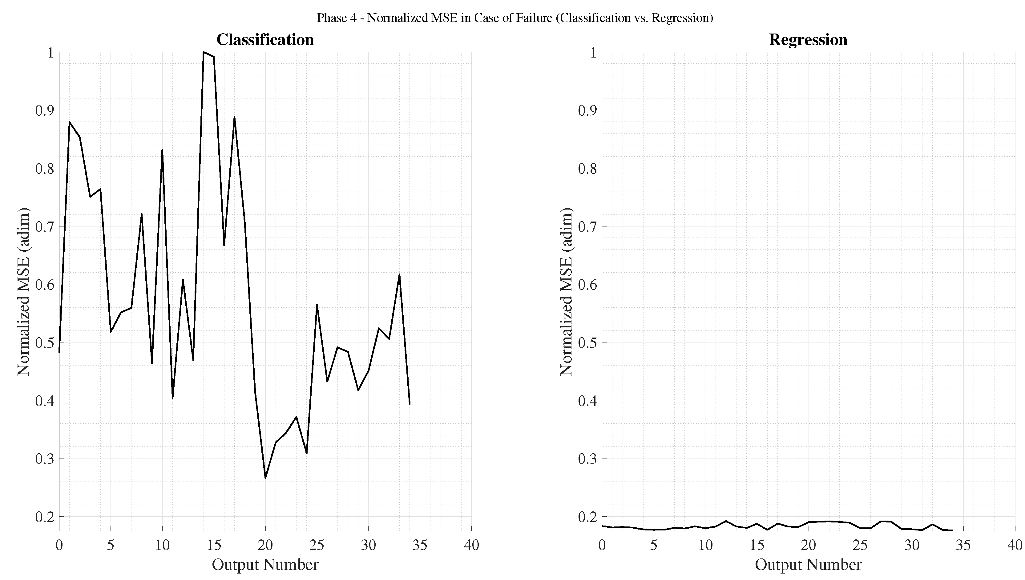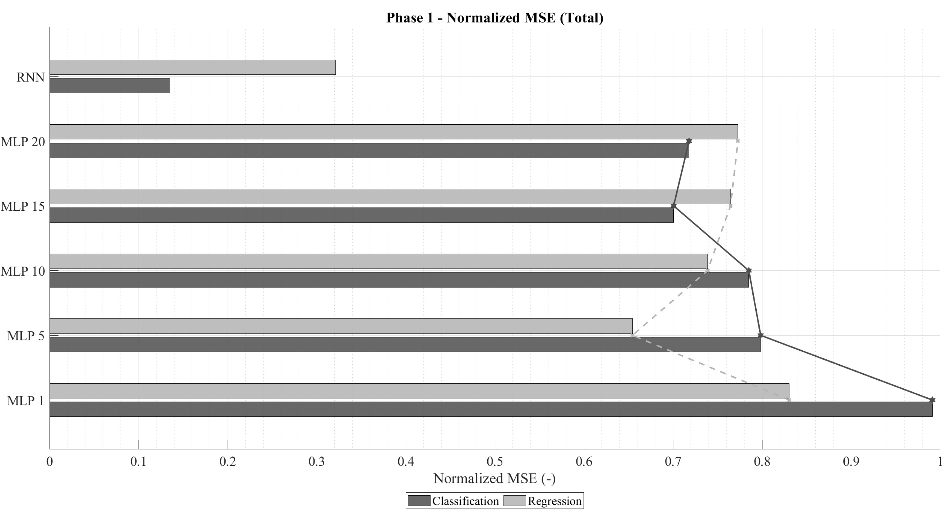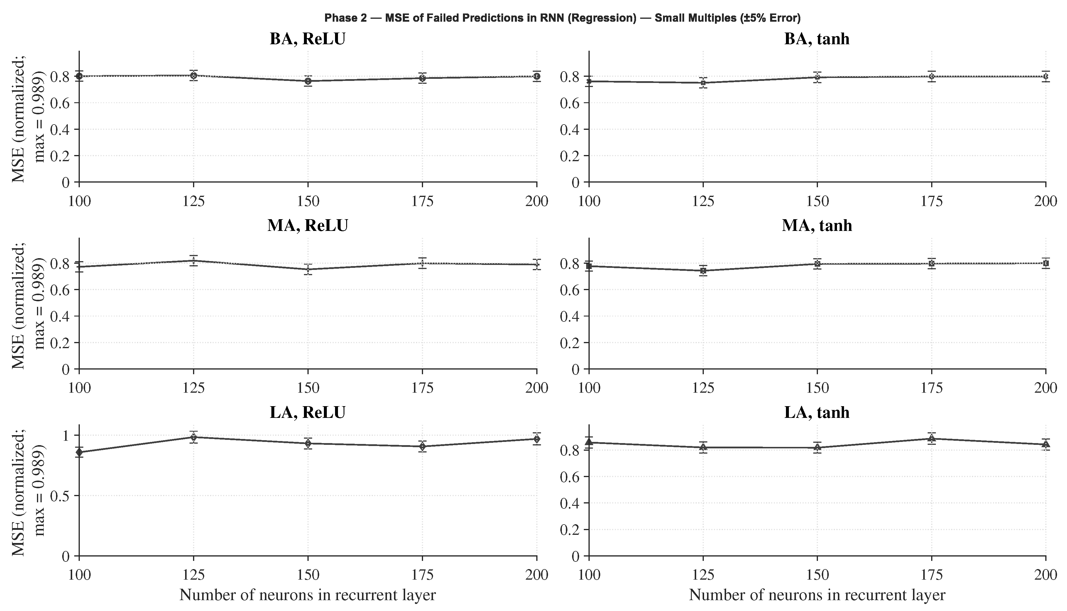 As shown in Figure 12, the simulated classification data display a greater number of isolated failures (single events uncorrelated with neighboring time steps) compared with the real model outcomes. However, the actual model produces larger and more diverse failure clusters—up to 16 consecutive time steps— whereas the randomized data rarely exceed four. A similar yet more pronounced behavior appears in the regression models (Figure 13), reflecting their lower overall accuracy. Empirically, this confirms that the conditional probability of failure given a previous failure is higher than the probability of failure given a previous success, i.e., . This observation is consistent with the temporal nature of RNNs, where consecutive inputs are similar and thus yield correlated prediction outcomes. It should be noted, however, that in a Simple RNN architecture, the recurrent connections propagate processed input information— not previous prediction errors—between consecutive time steps.